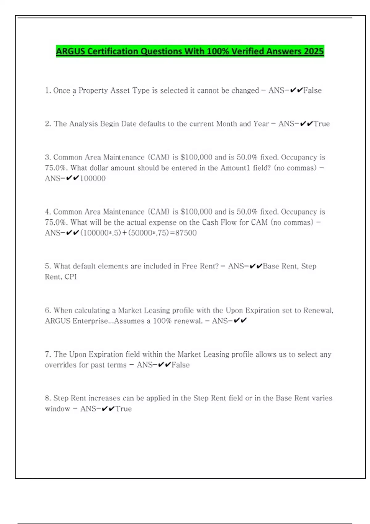 ARGUS Certification Questions With 100% Verified Answers 2025 1. Once a Property Asset Type is selected it cannot be changed - ANS-False 2. The Analysis Begin Date defaults to the current Month and Year - ANS-True 3. Common Area Maintenance (CAM) is $100,000 and is 50.0% fixed. Occupancy is 75.0%. What dollar amount should be entered in the Amount1 field? (no commas) - ANS-100000 4. Common Area Maintenance (CAM) is $100,000 and is 50.0% fixed. Occupancy is 75.0%. What will be the actual expense on the Cash Flow for CAM (no commas) - ANS-(100000*.5)+(50000*.75)=87500 5. What default elements are included in Free Rent? - ANS-Base Rent, Step Rent, CPI 6. When calculating a Market Leasing profile with the Upon Expiration set to Renewal, ARGUS Enterprise...Assumes a 100% renewal. - ANS- 7. The Upon Expiration field within the Market Leasing profile allows us to select any overrides for past terms - ANS-False 8. Step Rent increases can be applied in the Step Rent field or in the Base Rent varies window - ANS-