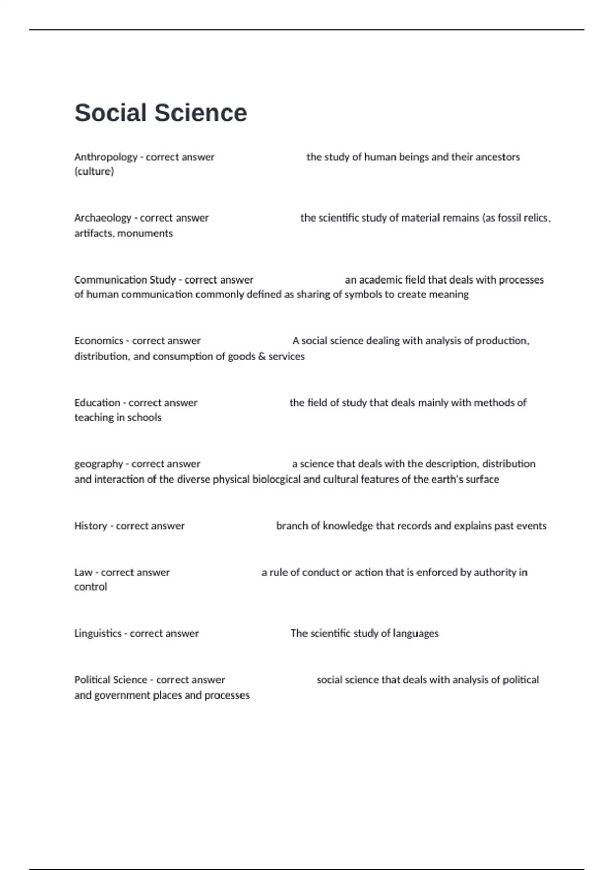 Anthropology - correct answer the study of human beings and their ancestors (culture) Archaeology - correct answer the scientific study of material remains (as fossil relics, artifacts, monuments Communication Study - correct answer an academic field that deals with processes of human communication commonly defined as sharing of symbols to create meaning Economics - correct answer A social science dealing with analysis of production, distribution, and consumption of goods & services Education - correct answer the field of study that deals mainly with methods of teaching in schools geography - correct answer a science that deals with the description, distribution and interaction of the diverse physical biolocgical and cultural features of the earth's surface History - correct answer branch of knowledge that records and explains past events Law - correct answer a rule of conduct or action that is enforced by authority in control Linguistics - correct answer The scientific study of languages Political Science - correct answer social science that deals with analysis of political and government places and processes Psychology - correct answer the science of the mind and behavior Sociology - correct answer The study of the behaviour of people in groups Anthropologist - correct answer Anthropolgy Archaeologist - correct answer Archaeology Public Relations - correct answer Communications study Economist - correct answer studys economy Teacher - correct answer Education Geographer - correct answer study of human geography Historian - correct answer studies history Lawyer - correct answer study Law - criminologist Linquist - correct answer studys linguists (language) politician - correct answer study political science psychologist - correct answer studys mind and behavior- psychology sociologist - correct answer study's collectie behavior of groups