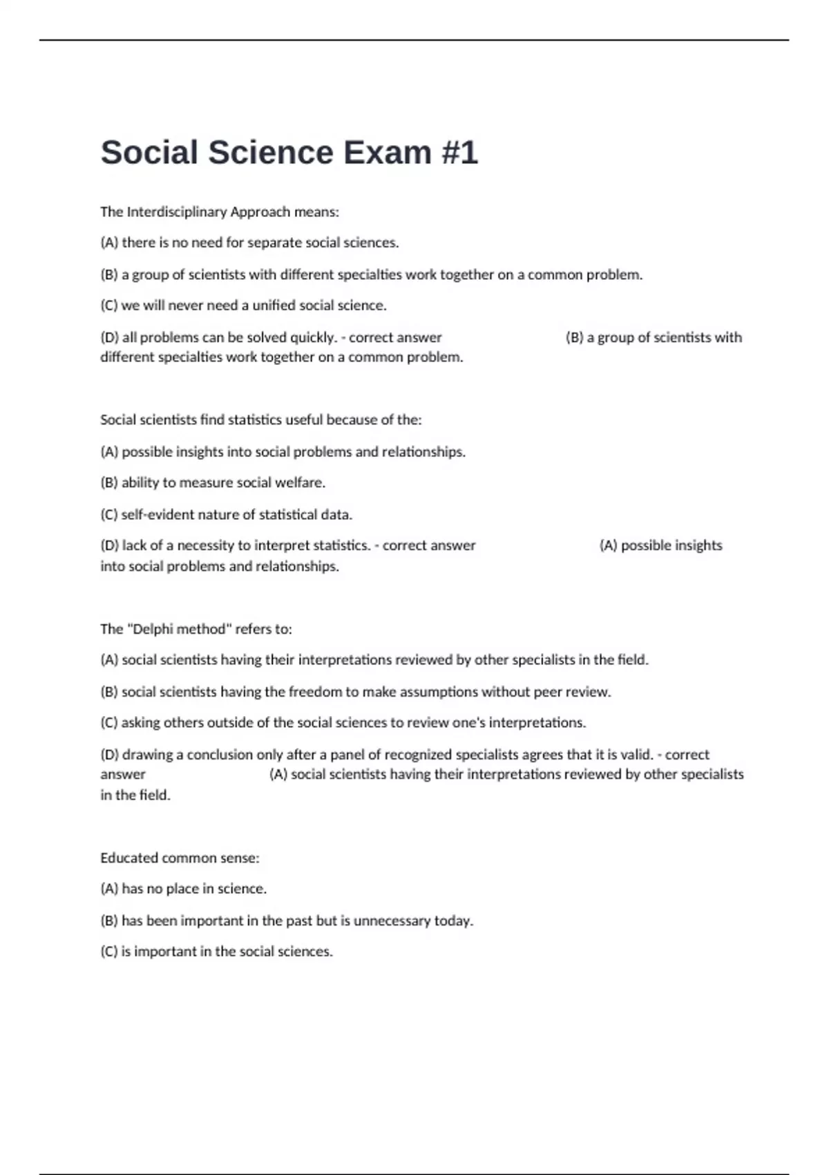 The Interdisciplinary Approach means: (A) there is no need for separate social sciences. (B) a group of scientists with different specialties work together on a common problem. (C) we will never need a unified social science. (D) all problems can be solved quickly. - correct answer (B) a group of scientists with different specialties work together on a common problem. Social scientists find statistics useful because of the: (A) possible insights into social problems and relationships. (B) ability to measure social welfare. (C) self-evident nature of statistical data. (D) lack of a necessity to interpret statistics. - correct answer (A) possible insights into social problems and relationships. The "Delphi method" refers to: (A) social scientists having their interpretations reviewed by other specialists in the field. (B) social scientists having the freedom to make assumptions without peer review. (C) asking others outside of the social sciences to review one's interpretations. (D) drawing a conclusion only after a panel of recognized specialists agrees that it is valid. - correct answer (A) social scientists having their interpretations reviewed by other specialists in the field. Educated common sense: (A) has no place in science. (B) has been important in the past but is unnecessary today. (C) is important in the social sciences. (D) is better than any rules about science. - correct answer (C) is important in the social sciences. The social science method that involves making a detailed examination and analysis of a particular issue or problem situation is called the: (A) comparative method. (B) case method. (C) historical method. (D) cross-cultural method. - correct answer (B) case method. Functionalist, conflict, exchange, and symbolic interaction are four major theoretical approaches that are: (A) mutually exclusive as theoretical approaches. (B) used together as a combined approach instead of being used separately. (C) necessarily independent of each other. (D) sometimes used in combination to study problems. - correct answer (D) sometimes used in combination to study problems. The functionalist theory approach emphasizes: (A) how society reflects individuals' desires. (B) social reality as being more what people think and feel rather than actions. (C) energy procurement. (D) the interconnectedness of social life. - correct answer (D) the interconnectedness of social life. Joseph Holz's study of the implications of teen pregnancy concluded that whether or not mothers had borne a child in their teens made: (A) a major difference in their economic and social positions. (B) little difference in their economic and social positions. (C) a difference which was received well by conservatives. (D) a difference which was popular with both liberals and conservatives. - correct answer (A) a major difference in their economic and social positions. Which of the following is NOT one of the nine steps of scientific research outlined in your text? (A) Defining the problem before drawing a conclusion. (B) Reviewing the literature. (C) Determining a time frame. (D) Analyzing the results. - correct answer (C) Determining a time frame. The study of social arrangements to maintain peace and order within a given society is called: (A) economics. (B) anthropology. (C) geography. (D) political science. - correct answer (D) political science. Thomas Kuhn argued that scientific progression occurs by paradigm shifts. A paradigm is: (A) a scientific method and the technology that supports it. (B) a scientific record-keeping method. (C) a scientific theory and the core of beliefs that surround it. (D) a way of understanding without evidence. - correct answer (C) a scientific theory and the core of beliefs that surround it. Language is important in the communication of social scientific knowledge. Social scientists are aware that language: (A) should require layers of translation. (B) used in high theory must, of necessity, include specialty-specific jargon to enhance understanding. (C) embodies value judgments and preserves ways of looking at things. (D) used to convey brilliant ideas will be complex. - correct answer (C) embodies value judgments and preserves ways of looking at things. The Enlightenment established the ""three humiliations"" of human beings. These include: (A) the earth is the center of the universe. (B) we are not creatures of nature like other animals. (C) humans cannot guide or direct social change. (D) our reasoning ability is subject to passions and subconscious desires. - correct answer (D) our reasoning ability is subject to passions and subconscious desires. Since its conception, social science has entwined two aspects. Sometimes it is simply trying to achieve a limited understanding of our place in the cosmos, and at other times it is trying to: (A) finalize an unlimited, complete explanation of human total reality. (B) evolve into a theology of human behavior. (C) change society. (D) become a physical science. - correct answer (C) change society. Anthropology is the study of the relationship between: (A) environment and trading systems. (B) biological traits and socially acquired characteristics. (C) physics and biology. (D) marketing strategies and geography (climate and resource allocation systems). - correct answer (B) biological traits and socially acquired characteristics. There are many different social science disciplines with varying approaches, but