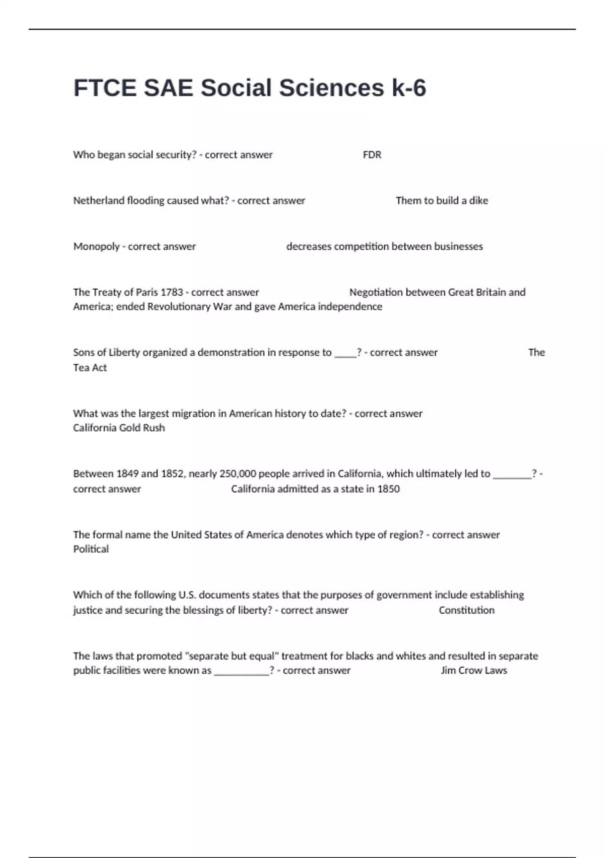 Who began social security? - correct answer FDR Netherland flooding caused what? - correct answer Them to build a dike Monopoly - correct answer decreases competition between businesses The Treaty of Paris 1783 - correct answer Negotiation between Great Britain and America; ended Revolutionary War and gave America independence Sons of Liberty organized a demonstration in response to ____? - correct answer The Tea Act What was the largest migration in American history to date? - correct answer California Gold Rush Between 1849 and 1852, nearly 250,000 people arrived in California, which ultimately led to _______? - correct answer California admitted as a state in 1850 The formal name the United States of America denotes which type of region? - correct answer Political Which of the following U.S. documents states that the purposes of government include establishing justice and securing the blessings of liberty? - correct answer Constitution The laws that promoted "separate but equal" treatment for blacks and whites and resulted in separate public facilities were known as __________? - correct answer Jim Crow Laws Who were the Rough Riders? - correct answer were a cavalry of cowboys, scholars, Native Americans, and African Americans who fought in the Spanish-American War The Rough Riders were established by who? - correct answer Theodore Roosevelt Between 1962 and 1980, which of the following scenarios had the greatest impact on the state of Florida's economy and culture? - correct answer Cuba Fidel Castro After WWII, the Soviets blocked supplies from getting into ______. - correct answer Germany After WWII, the Soviets blocked supplies from getting into Germany. This directly resulted in the _______. - correct answer Berlin Airlift The Missouri Compromise allowed the state of Missouri to __________ - correct answer join the union as a slave state The Sixth Amendment to the United States Constitution guarantees - correct answer an accused the right to representation by counsel in serious criminal prosecutions. The responsibility for appointing counsel in federal criminal proceedings for those unable to bear the cost of representation has historically rested in the ______________ - correct answer federal judiciary The responsibility for appointing counsel in federal criminal proceedings for those unable to bear the cost of representation has historically rested in the federal judiciary. What is this role called? - correct answer Public Defense Attorney How many Supreme Court justices serve on the US Supreme Court? - correct answer 9 The Bill of Rights consists of which amendments? - correct answer Amendments 1-10 (I-X) When a river, such as the Nile, carries sediment towards a large body of water such as the ocean or a lake, it deposits sediment and the flow of water decreases. This area is called a ______ - correct answer delta During the colonization of North America, what intellectual movement developed that contributed to the founding of universities and the study of science? - correct answer Enlightenment Which president was elected for a third term? - correct answer FDR First constitution written for the 13 colonies - correct answer Articles of Confederation Mesopotamia - correct answer valley between Tigris and Euphrates state level executive - correct answer Governor Supreme court settles _______ - correct answer land disputes between federal and state Congress is broken into what two branches - correct answer house of representatives; senate Legislative Branch - correct answer Congress (house and senate) Executive Branch - correct answer President and Vice President Judicial Branch - correct answer Supreme Court Nile river flows - correct answer south to north Andrew Carnegie - correct answer father of steel Special purpose map - correct answer A map that shows a certain country, city, or ways of transportation. Medici patronage - correct answer art Quebec near what river? - correct answer St. Lawrence River Where is the most likely place a medieval king would build his castle? - correct answer Moat around castle, drawbridge, steep walls, on a mountain/hill manifest destiny - correct answer The philosophy and belief that America should expand its borders from Pacific to the Atlantic Ocean's and as far north and south as possible Classic 7 Wonders - correct answer Great Pyramid of Giza Hanging Gardens of Babylon Statue of Zeus at Olympia Temple of Artemis at Ephesus Mausoleum at Halicarnassus Colossus of Rhodes Lighthouse of Alexandria What is the name of the powerful, warm, and swift ocean current that originates at the tip of Florida and follows the eastern coastlines of the United States and helps to regulate the climates of the East Coast of the United States and of Europe? - correct answer Gulf Stream Which of the following responsibilities fall under the duty of the federal government of the United States? - correct answer printing money
