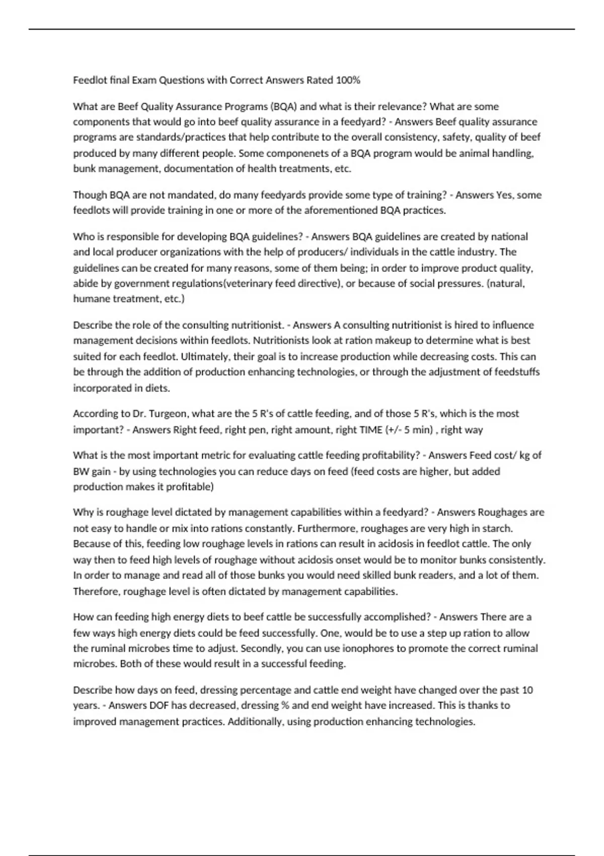 Feedlot final Exam Questions with Correct Answers Rated 100% What are Beef Quality Assurance Programs (BQA) and what is their relevance? What are some components that would go into beef quality assurance in a feedyard? - Answers Beef quality assurance programs are standards/practices that help contribute to the overall consistency, safety, quality of beef produced by many different people. Some componenets of a BQA program would be animal handling, bunk management, documentation of health treatments, etc. Though BQA are not mandated, do many feedyards provide some type of training? - Answers Yes, some feedlots will provide training in one or more of the aforementioned BQA practices. Who is responsible for developing BQA guidelines? - Answers BQA guidelines are created by national and local producer organizations with the help of producers/ individuals in the cattle industry. The guidelines can be created for many reasons, some of them being; in order to improve product quality, abide by government regulations(veterinary feed directive), or because of social pressures. (natural, humane treatment, etc.) Describe the role of the consulting nutritionist. - Answers A consulting nutritionist is hired to influence management decisions within feedlots. Nutritionists look at ration makeup to determine what is best suited for each feedlot. Ultimately, their goal is to increase production while decreasing costs. This can be through the addition of production enhancing technologies, or through the adjustment of feedstuffs incorporated in diets. According to Dr. Turgeon, what are the 5 R's of cattle feeding, and of those 5 R's, which is the most important? - Answers Right feed, right pen, right amount, right TIME (+/- 5 min) , right way What is the most important metric for evaluating cattle feeding profitability? - Answers Feed cost/ kg of BW gain - by using technologies you can reduce days on feed (feed costs are higher, but added production makes it profitable) Why is roughage level dictated by management capabilities within a feedyard? - Answers Roughages are not easy to handle or mix into rations constantly. Furthermore, roughages are very high in starch. Because of this, feeding low roughage levels in rations can result in acidosis in feedlot cattle. The only way then to feed high levels of roughage without acidosis onset would be to monitor bunks consistently. In order to manage and read all of those bunks you would need skilled bunk readers, and a lot of them. Therefore, roughage level is often dictated by management capabilities. How can feeding high energy diets to beef cattle be successfully accomplished? - Answers There are a few ways high energy diets could be feed successfully. One, would be to use a step up ration to allow the ruminal microbes time to adjust. Secondly, you can use ionophores to promote the correct ruminal microbes. Both of these would result in a successful feeding. Describe how days on feed, dressing percentage and cattle end weight have changed over the past 10 years. - Answers DOF has decreased, dressing % and end weight have increased. This is thanks to improved management practices. Additionally, using production enhancing technologies. How are the majority of fed cattle marketed today? - Answers On a carcass basis How was the NCBA beef sustainability analysis conducted? - Answers They analyzed the sustainability of beef by breaking down sustainability in 3 prongs. Environmental - Economic - Social; and quantitatively looked at the overall trend of the industry in this area over the past 30 years. What are the three pillars that the NCBA beef sustainability project is built upon? - Answers Environment - Economic - Social