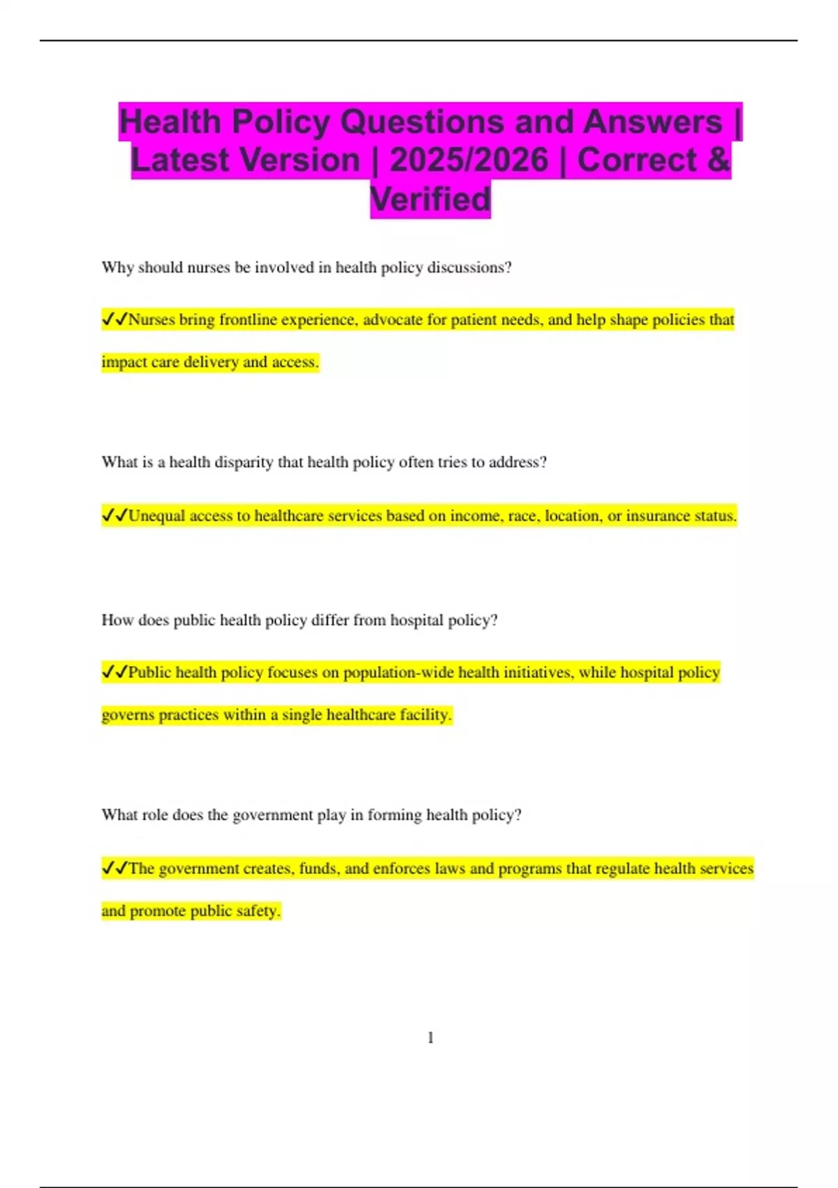 Health Policy Questions and Answers | Latest Version | 2025/2026 | Correct & Verified Why should nurses be involved in health policy discussions? Nurses bring frontline experience, advocate for patient needs, and help shape policies that impact care delivery and access. What is a health disparity that health policy often tries to address? Unequal access to healthcare services based on income, race, location, or insurance status. How does public health policy differ from hospital policy? Public health policy focuses on population-wide health initiatives, while hospital policy governs practices within a single healthcare facility. What role does the government play in forming health policy? The government creates, funds, and enforces laws and programs that regulate health services and promote public safety. 2 What is an example of a federal health policy in the United States? The Affordable Care Act, which aimed to expand health insurance coverage and reduce healthcare costs. How do health policies impact nursing practice? They influence scope of practice, patient care protocols, documentation standards, and reimbursement for services. What is an unintended consequence of poorly planned health policy? It can create barriers to care, increase provider workload, or reduce access for vulnerable populations. Why is policy evaluation important in healthcare? It measures the effectiveness of a policy and helps determine if changes or improvements are needed. What does advocacy mean in the context of health policy? Advocacy involves actively supporting or proposing changes to laws and regulations to improve patient outcomes or working conditions. 3 How can a nurse advocate for policy change? By contacting legislators, joining professional organizations, or participating in public forums or advocacy campaigns. What is a policy brief? A policy brief is a concise summary of an issue, its background, and suggested actions aimed at influencing decision-makers. What is the purpose of health insurance policies? To provide financial protection against high medical costs and improve access to necessary health services. What is a key barrier to implementing new health policies? Resistance to change from stakeholders or lack of funding and resources. What is meant by health equity in policy discussions? Ensuring all individuals have fair and just access to the