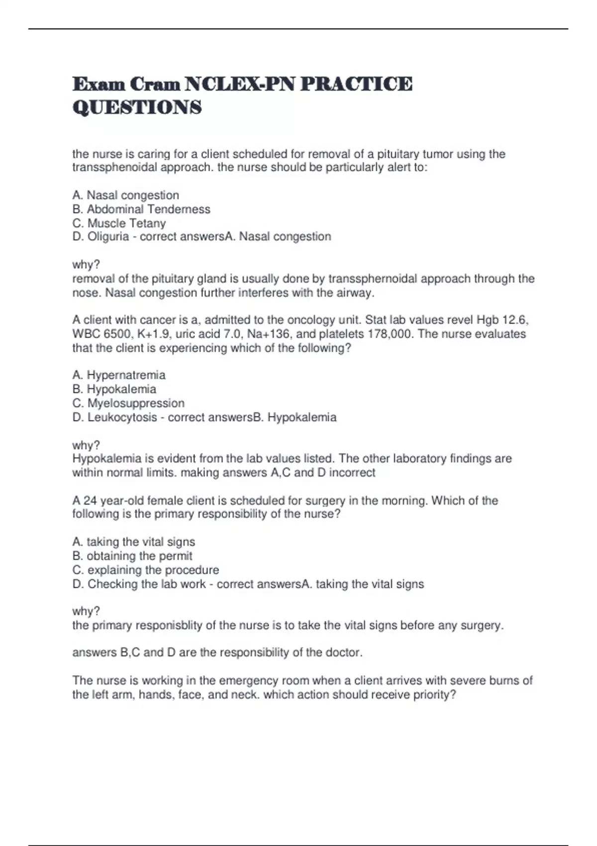 the nurse is caring for a client scheduled for removal of a pituitary tumor using the transsphenoidal approach. the nurse should be particularly alert to: A. Nasal congestion B. Abdominal Tenderness C. Muscle Tetany D. Oliguria - correct answersA. Nasal congestion why? removal of the pituitary gland is usually done by transsphernoidal approach through the nose. Nasal congestion further interferes with the airway. A client with cancer is a, admitted to the oncology unit. Stat lab values revel Hgb 12.6, WBC 6500, K+1.9, uric acid 7.0, Na+136, and platelets 178,000. The nurse evaluates that the client is experiencing which of the following? A. Hypernatremia B. Hypokalemia C. Myelosuppression D. Leukocytosis - correct answersB. Hypokalemia why? Hypokalemia is evident from the lab values listed. The other laboratory findings are within normal limits. making answers A,C and D incorrect A 24 year-old female client is scheduled for surgery in the morning. Which of the following is the primary responsibility of the nurse? A. taking the vital signs B. obtaining the permit C. explaining the procedure D. Checking the lab work - correct answersA. taking the vital signs why? the primary responisblity of the nurse is to take the vital signs before any surgery. answers B,C and D are the responsibility of the doctor. The nurse is working in the emergency room when a client arrives with severe burns of the left arm, hands, face, and neck. which action should receive priority? A. starting an IV? B. Applying oxygen C.Obtaining blood gas D. Medicating the client foe pain - correct answersB. Applying oxygen why? the client with burns to the neck needs airway assessments and supplemental oxygen, so applying oxygen is priority. the next action should be to start an IV and medicate for pain. The nurse is visiting a home health client with osteoporosis. The client has a new prescription for alendronate (Fosamax). Which instructions should be given to the client A. rest in bed after taking the medication for at least 30 mins B. Avoid rapid movements after taking the medication C. Take medication with water only D. Allow at least 1 hour between taking the medicine and taking other medications - correct answersC. Take medication with water only why? Fosmax should be taken with water only. The client should also remain upright for at least 30 mins after taking the medication. The nurse is making initial rounds on a client with a C5 fracture and crutchfield thongs. Which equipment should be kept at the bedside? A. A pair of forceps B. A torque wrench C. A pair or wire cutters D. A screwdriver - correct answersB. A torque wrench why? A tourque wrench is kept at the bedside to tighten and loosen the screws of crutchfield tongs. This wrench controls the amount of pressure that is placed on the screws. An infant weighs 7 pounds at birth. The excpectd weight by 1 year should be: A. 10 pounds B.12 pounds C. 18 pounds D. 21 pounds - correct answersD. 21 po