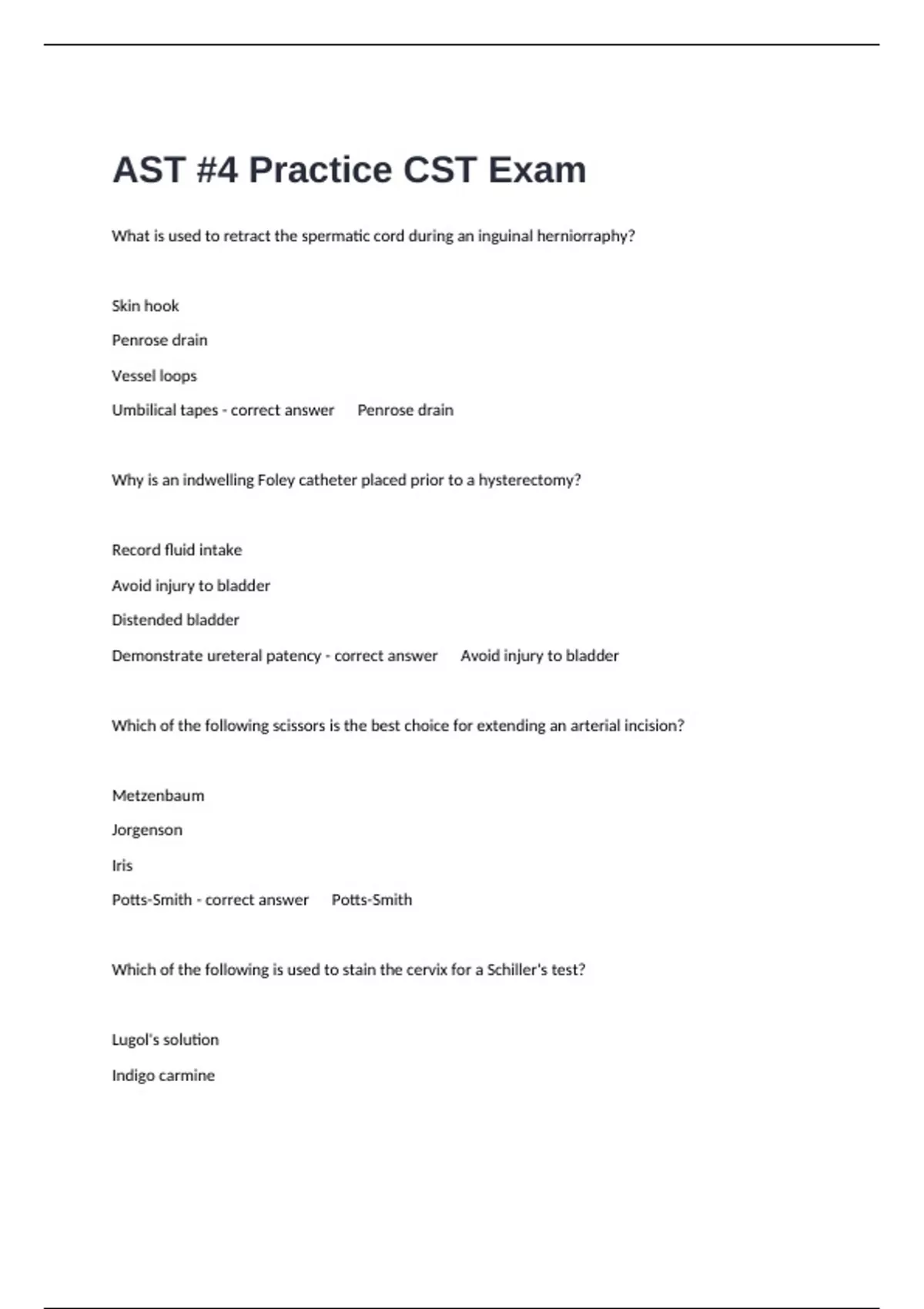 What is used to retract the spermatic cord during an inguinal herniorraphy? Skin hook Penrose drain Vessel loops Umbilical tapes - correct answer Penrose drain Why is an indwelling Foley catheter placed prior to a hysterectomy? Record fluid intake Avoid injury to bladder Distended bladder Demonstrate ureteral patency - correct answer Avoid injury to bladder Which of the following scissors is the best choice for extending an arterial incision? Metzenbaum Jorgenson Iris Potts-Smith - correct answer Potts-Smith Which of the following is used to stain the cervix for a Schiller's test? Lugol's solution Indigo carmine Methylene blue Acetic acid - correct answer Lugol's solution Which of the following arises from the left ventricle of the heart? Ascending aorta Pulmonary vein Descending aorta Pulmonary artery - correct answer Ascending aorta What method is used to confirm that items have been exposed to the sterilization process, but sterility is not guaranteed? Mechanical Biological Chemical Bowie-Dick - correct answer Chemical Why would the hair of a patient undergoing craniotomy be bagged, labeled and saved? To donate to cancer patients In case of need for future genetic testing It is patient property Prevent post-op surgical site infection - correct answer It is patient property When preparing a double basin for sterilization, the: - Basins should be separated by a porous, absorbent towel - Sponges should be placed in the top basin - Wrapped package should be laid flat on the shelf of the sterilizing cart - Bottom basin should contain a residual of distilled water - correct answer Basins should be separated by a porous, absorbent towel *Which structure, during a total hip arthroplasty, requires intramedullary reaming prior to placement of a prosthesis? Femoral canal Tibial plateau Acetabular fossa Greater trochanter - correct answer Femoral canal Which of the following is the least restrictive form of credentialing? Certification Licensure Registration Accreditation - correct answer Registration *What drug classification is Demerol? Dilator Analgesic Vasoconstrictor Sedative - correct answer Vasoconstrictor *What should be transported to the PACU with a patient who underwent a thyroidectomy? Tracheotomy tray Clean stent dressing Extra Penrose drain Antiembolic stockings - correct answer Tracheotomy tray What is the chemical abbreviation for sodium chloride? Fe Hg NaCl H20 - correct answer NaCl *Which organelle is responsible for packaging of proteins? Golgi complex Mitochondria Nucleus Ribosome - correct answer Golgi complex Which procedure would utilize the instrument shown below? D&C Hemorrhoidectomy Gastrostomy TURP - correct answer Hemorrhoidectomy What types of treatment does a patient authorize when signing a general consent form? Only for receiving general anesthesia Invasive surgical procedures Receiving experimental drugs All routine treatments or procedures - correct answer All routine treatments or procedures *Which medication can be used as a topical jelly during cystoscopy procedures? Bupivacaine Xylocaine Sensorcaine Procaine - correct answer Xylocaine Which of the following is a primary postoperative complication of carotid endarterectomy? Failure of graft Pulmonary embolus Pneumonia Stroke - correct answer Stroke *During which procedure would the instrument shown below be used? D&C TAH MMK LAVH - correct answer TAH When is it acceptable to open surgical dressing sponges? After first count After skin incision After final count After closure of cavity - correct answer After final count What is the correct procedure to follow when a sterilized rigid instrument container is opened and condensation is observed? Don't use; return to Sterile Processing Department Let container air dry before use Dry out with a sterile towel before using Use it; water droplets are sterile - correct answer Don't use; return to Sterile Processing Department *Which method of sterilization requires an aeration cycle? lonizing radiation EtO Peracetic acid Hydrogen peroxide plasma - correct answer EtO