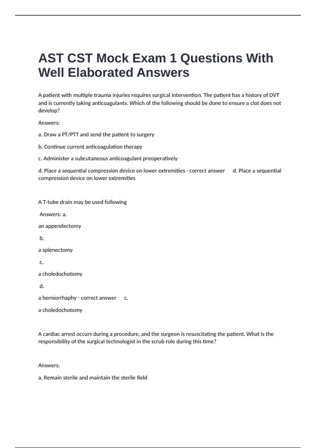 A patient with multiple trauma injuries requires surgical intervention. The patient has a history of DVT and is currently taking anticoagulants. Which of the following should be done to ensure a clot does not develop? Answers: a. Draw a PT/PTT and send the patient to surgery b. Continue current anticoagulation therapy c. Administer a subcutaneous anticoagulant preoperatively d. Place a sequential compression device on lower extremities - correct answer d. Place a sequential compression device on lower extremities A T-tube drain may be used following Answers: a. an appendectomy b. a splenectomy c. a choledochotomy d. a herniorrhaphy - correct answer c. a choledochotomy A cardiac arrest occurs during a procedure, and the surgeon is resuscitating the patient. What is the responsibility of the surgical technologist in the scrub role during this time? Answers: a. Remain sterile and maintain the sterile field b. Break scrub and call for help c. Move the electrosurgical unit (ESU) away from the operating table d. Hand the surgeon a loaded needle holder and forceps for closing - correct answer Remain sterile and maintain the sterile field A cerclage procedure is performed for which of the following conditions? Answers: a. Bartholin's cyst b. placenta previa c. ectopic pregnancy d. incompetent cervix - correct answer d. incompetent cervix A colonoscopy has just concluded, and it is time to reprocess the instruments utilized in the case. Which of the following is the MOST effective method for processing the endoscopes? Answers: a. gravity displacement sterilizer b. cobalt-60 radiation c. ethylene oxide d. glutaraldehyde - correct answer d. glutaraldehyde A device used to measure fluid pressure is known as a Answers: a. manometer b. spirometer c. thermometer d. capnometer - correct answer manometer A form of contrast media used within the body that is visible when exposed to x-ray is Answers: a. endogenous b. exogenous c. radiopaque d. radiolucent - correct answer c. radiopaque A liver laceration is identified during an emergency exploratory laparotomy. A surgical technologist will prepare suture attached to which of the following types of needles? Answers: a. blunt b. conventional cutting c. reverse cutting d. tapered - correct answer blunt A nasogastric (NG) tube is used to Answers: a. dilate the lower esophageal sphincter b. promote vomiting c. monitor the pH of stomach contents d. drain the stomach - correct answer d. drain the stomach A pad-like sac or cavity that prevents friction within a joint is known as a Answers: a. fossa b. ligament c. bursa d. ganglion - correct answer c. bursa A patient has arrived in the operating room for a bilateral mastectomy. She is crying inconsolably. The surgical technologist can best console her by saying which of the following? Answers: a. "I am sure we will be able to remove all of the cancer." b. "We are going to give you the best care possible." c. "Everything will be fine." d. "Your surgeon is the best in the hospital." - correct answer b. "We are going to give you the best care possible." A patient is complaining of nausea, fever, and severe back pain. The patient was previously diagnosed with hyperparathyroidism. This patient MOST likely suffers from Answers: a. glomerulonephritis b. chordee c. hydrocele d. kidney stones - correct answer d. kidney stones A patient presented in the OR without family history related to anesthesia complications. Which of the following complications is of MOST concern related to the lack of family history? Answers: a. malignant hyperthermia b. cardiac arrest c. transfusion reaction d. bronchospasm - correct answer a. malignant hyperthermia A patient who is HIV-positive is having an abdominal procedure. Another patient who is HIV-negative is having an orthopedic procedure. During and subsequent to the cases, the surgical technologist should take Answers: a. standard precautions for both patients b. no precautions for either patient c. standard precautions for the HIV-positive patient d. standard precautions for the HIV-negative patient - correct answer a. standard precautions for both patients A pneumatic tourniquet may be used for extremity surgery to Answers: a. reduce blood loss b. create an anesthetic effect c. exsanguinate the extremity d. allow the surgeon more operating time - correct answer a. reduce blood loss A resectoscope is used in which of the following prostatic approaches? Answers: a. transurethral b. perineal c. suprapubic d. retropubic - correct answer a. transurethral A resectoscope is used to resect the Answers: a. prostate b. ovaries c. vas deferens d. fallopian tubes - correct answer a. prostate A surgeon asks for warm irrigation after a GI tract reanastomosis. Which of the following BEST describes the reason for irrigating at this point in the procedure? Answers: a. to eliminate any infection-causing microbes b. to clean out the area of any loose tissue c. to aid visual inspection for leakage d. to maintain the core body temperature - correct answer c. to aid visual inspection for leakage A surgeon has just completed an incisional biopsy and would like to have an immediate diagnosis. Which of the following is the MOST appropriate next step? Answers: a. Send the specimen to pathology in a specimen container containing normal saline so that a frozen section can be completed b. Send the specimen to pathology in a dry specimen container so that a frozen section can be completed c. Send the specimen to pathology in a specimen container containing normal saline so that a permanent section can be completed d. Send the specimen to pathology in a dry specimen container so that a permanent section can be completed - correct answer b. Send the specimen to pathology in a dry specimen container so that a frozen section can be completed A surgeon is performing a procedure to repair damage from a gunshot wound to the chest. Which of the following types of drains should the surgical technologist have available at the
