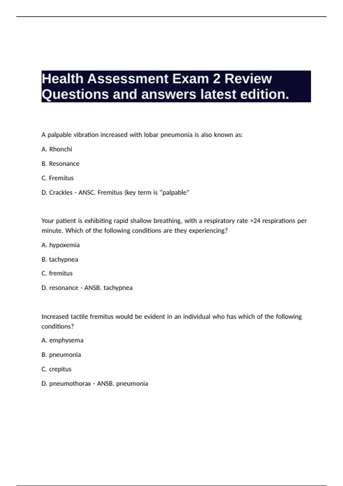Health Assessment Exam 2 Review Questions and answers latest edition.