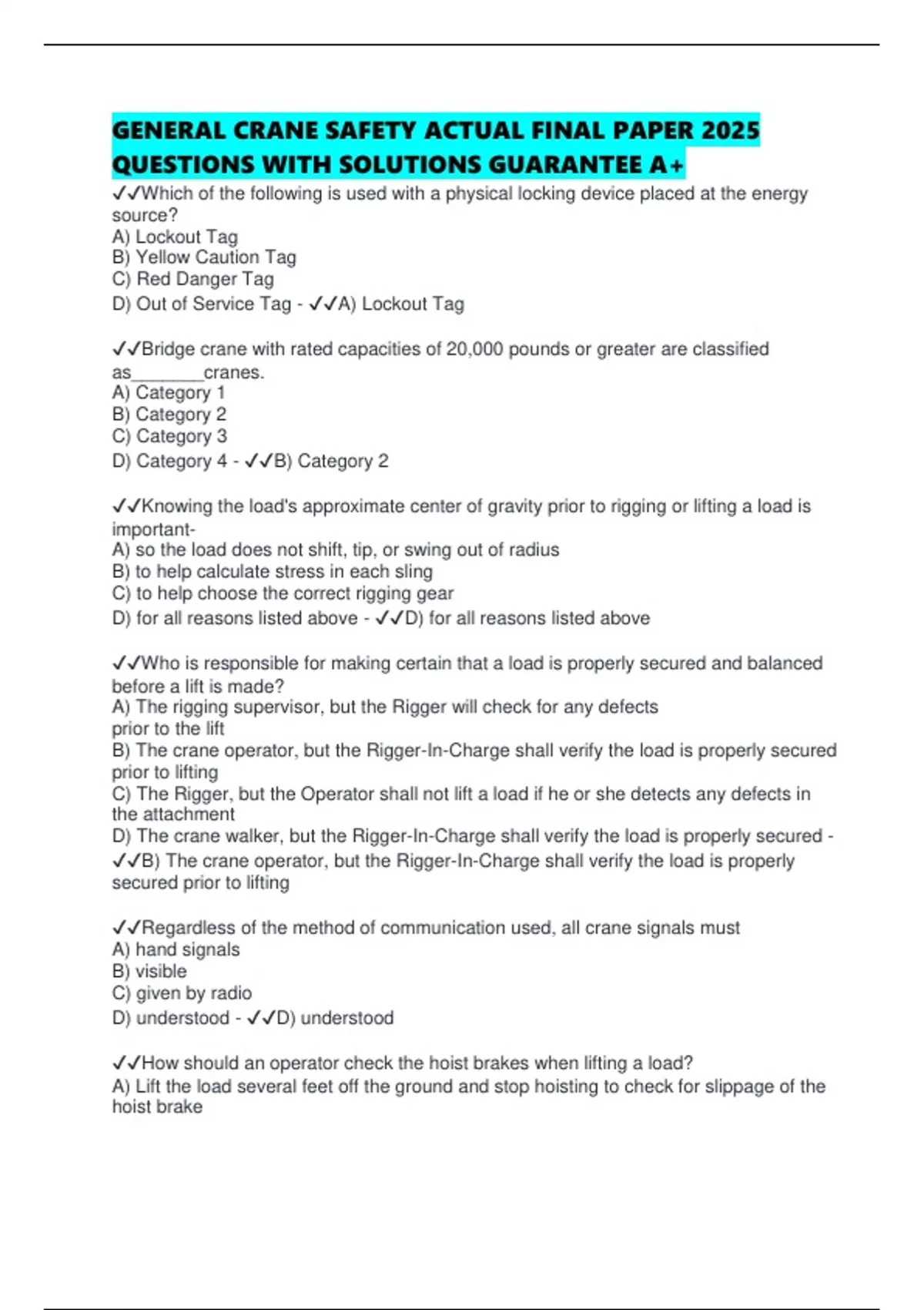 GENERAL CRANE SAFETY ACTUAL FINAL PAPER 2025 QUESTIONS WITH SOLUTIONS GUARANTEE A+ Which of the following is used with a physical locking device placed at the energy source? A) Lockout Tag B) Yellow Caution Tag C) Red Danger Tag D) Out of Service Tag - A) Lockout Tag Bridge crane with rated capacities of 20,000 pounds or greater are classified as_______cranes. A) Category 1 B) Category 2 C) Category 3 D) Category 4 - B) Category 2 Knowing the load's approximate center of gravity prior to rigging or lifting a load is importantA) so the load does not shift, tip, or swing out of radius B) to help calculate stress in each sling C) to help choose the correct rigging gear D) for all reasons listed above - D) for all reasons listed above