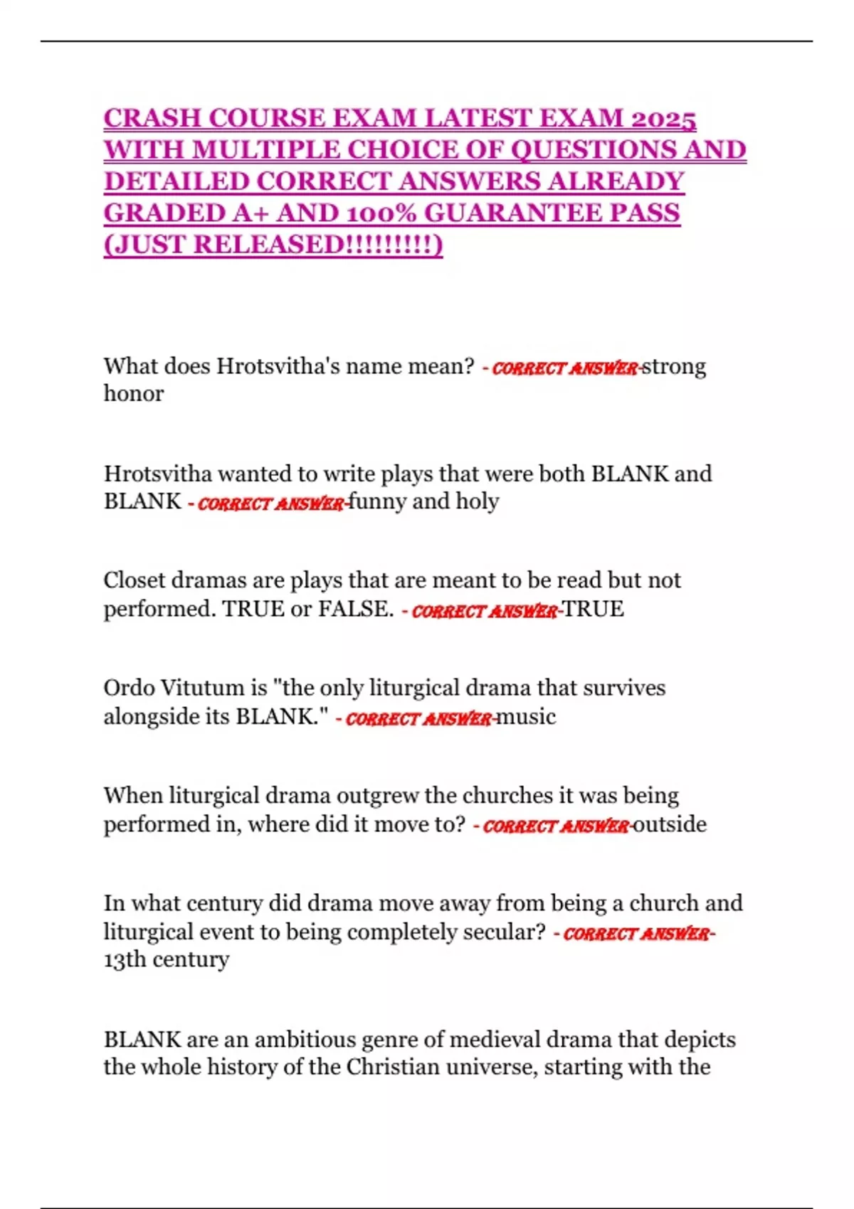What does Hrotsvitha's name mean? - CORRECT ANSWER-strong honor Hrotsvitha wanted to write plays that were both BLANK and BLANK - CORRECT ANSWER-funny and holy Closet dramas are plays that are meant to be read but not performed. TRUE or FALSE. - CORRECT ANSWER-TRUE Ordo Vitutum is "the only liturgical drama that survives alongside its BLANK." - CORRECT ANSWER-music When liturgical drama outgrew the churches it was being performed in, where did it move to? - CORRECT ANSWER-outside In what century did drama move away from being a church and liturgical event to being completely secular? - CORRECT ANSWER-13th century BLANK are an ambitious genre of medieval drama that depicts the whole history of the Christian universe, starting with the creation of the world and ending with the death and resurrection of christ. - CORRECT ANSWER-cycle plays What were the miracle plays about? - CORRECT ANSWER-the lives of saints Humanism is "the idea that earthly life isn't just a vale of BLANK that might lead to heaven if you're good, but maybe worthy in and of itself." - CORRECT ANSWER-tears