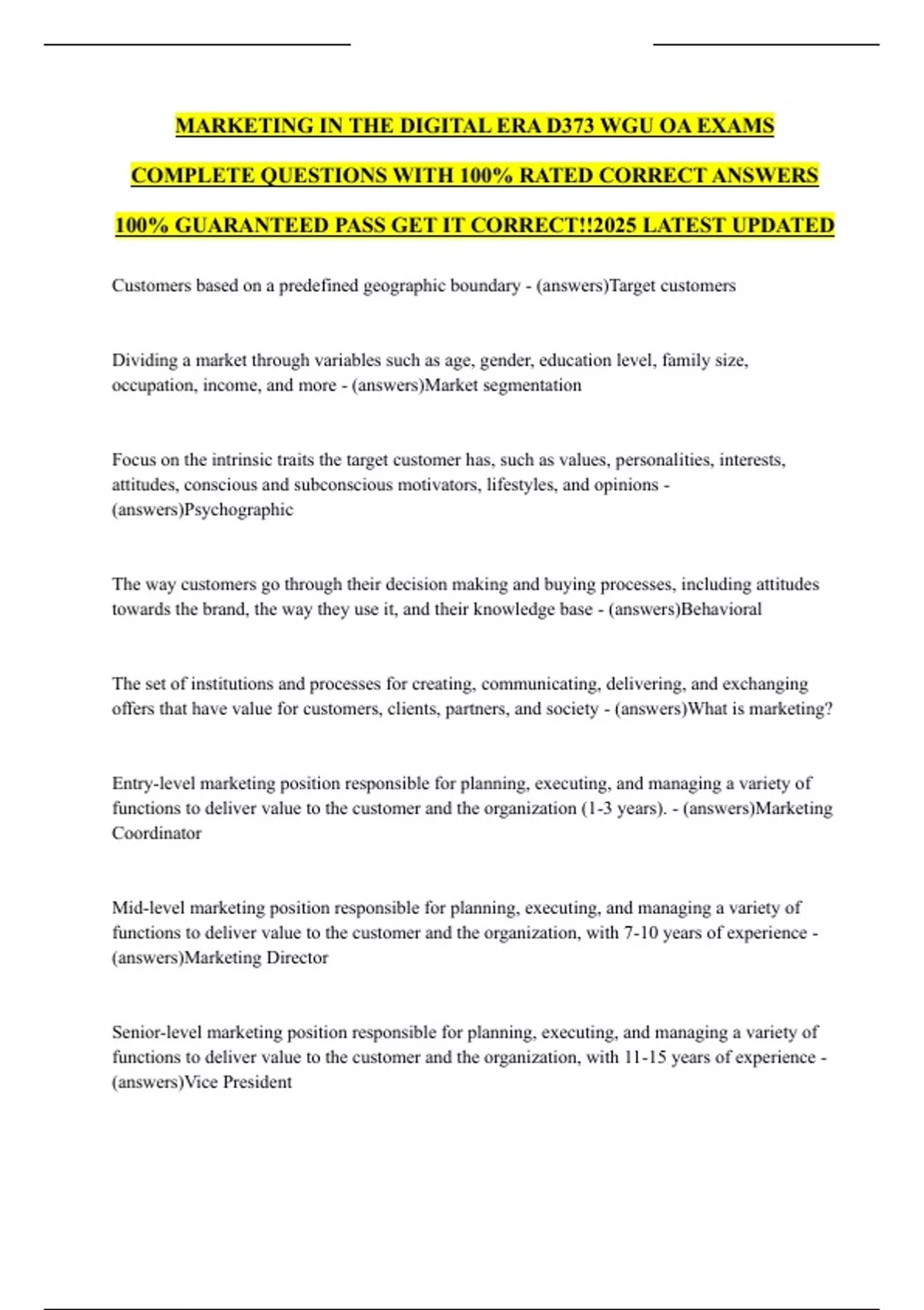 MARKETING IN THE DIGITAL ERA D373 WGU OA EXAMS COMPLETE QUESTIONS WITH 100% RATED CORRECT ANSWERS 100% GUARANTEED PASS GET IT CORRECT!!2025 LATEST UPDATED