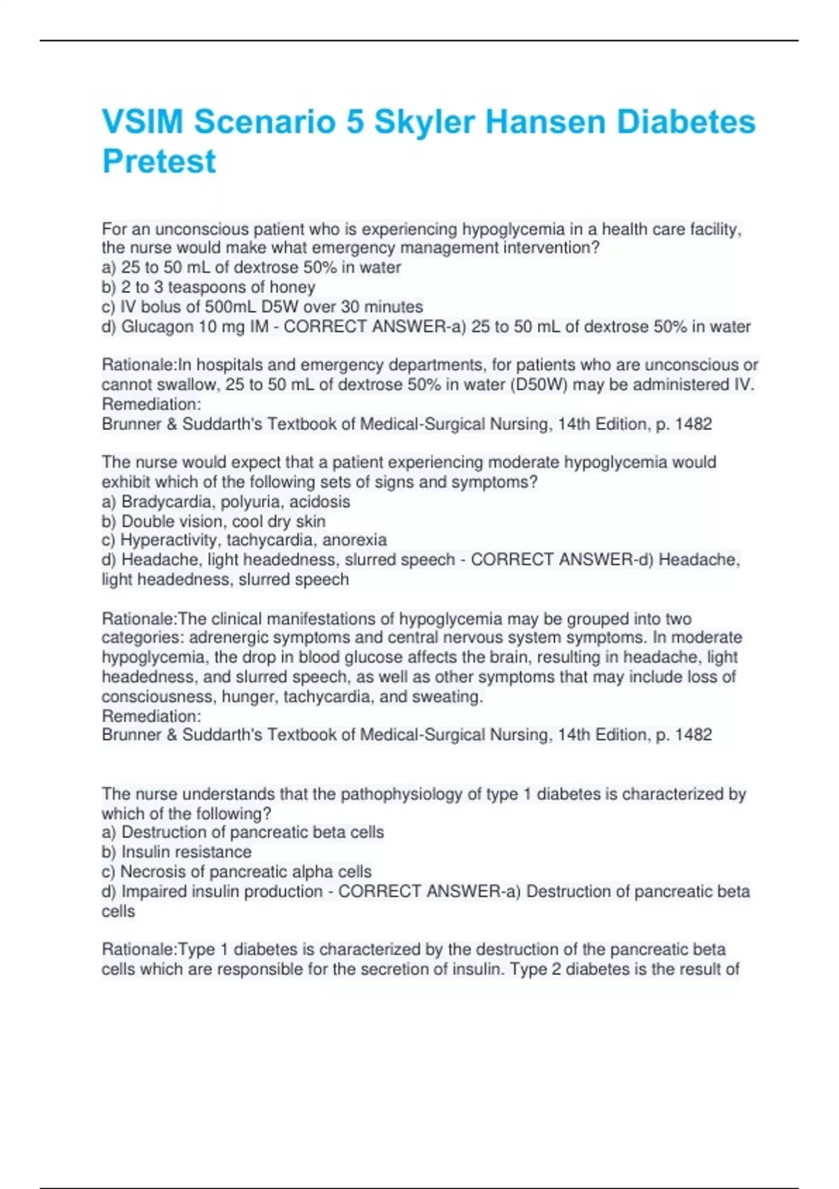 VSIM Scenario 5 Skyler Hansen Diabetes Pretest Questions and Answers Best rated A+ Guaranteed Success Latest Update