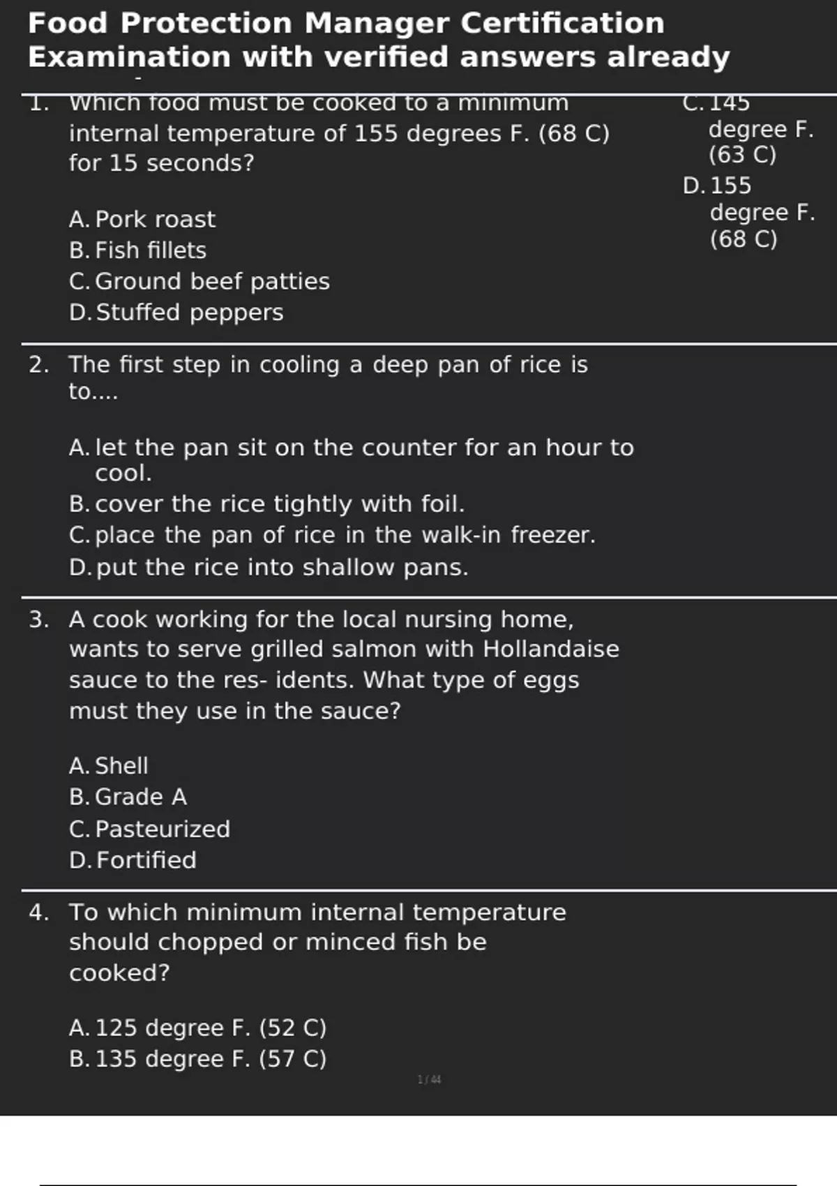 1. Which food must be cooked to a minimum C. 145