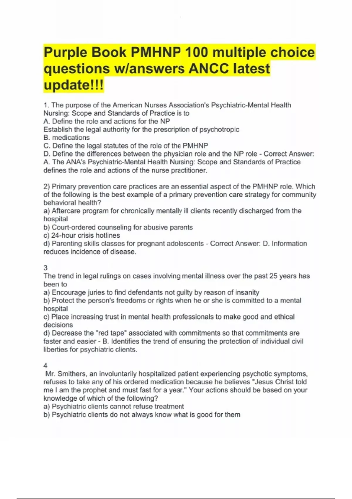 Purple Book PMHNP 100 multiple choice questions w-answers ANCC latest update!!! Purple Book PMHNP 100 multiple choice questions w-answers ANCC latest update!!!