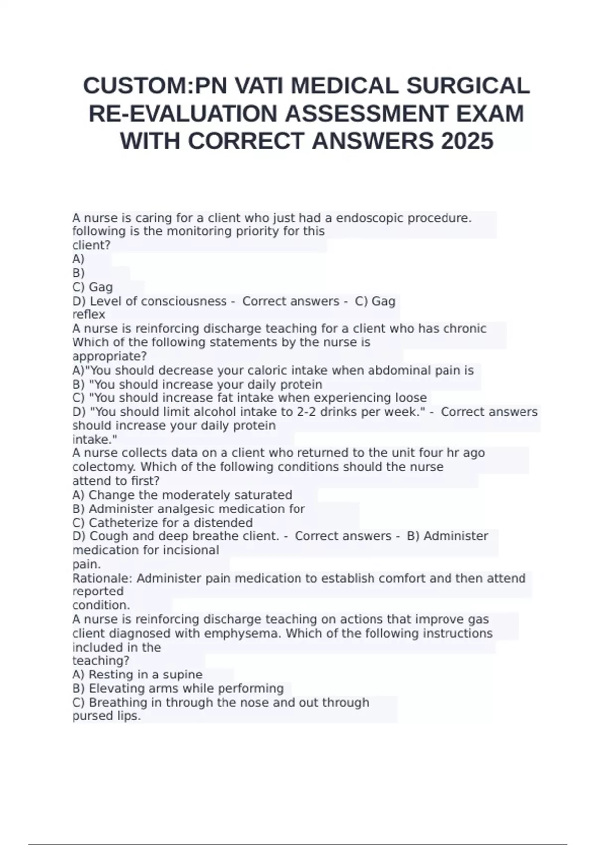 CUSTOM:PN VATI MEDICAL SURGICAL RE-EVALUATION ASSESSMENT EXAM WITH CORRECT ANSWERS 2025