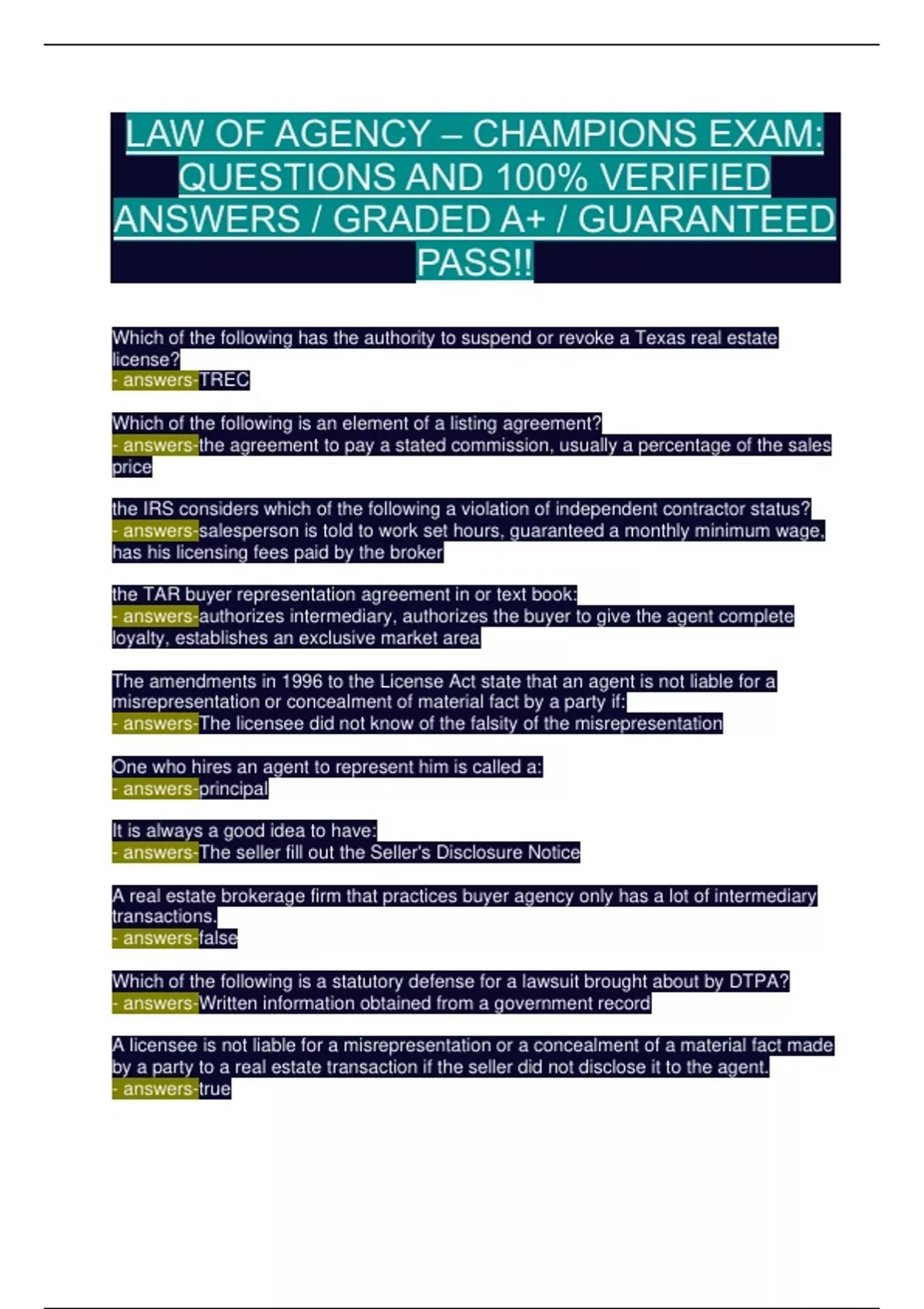 LAW OF AGENCY CHAMPIONS EXAM – 100% VERIFIED ANSWERS | TEXAS REAL ESTATE | GUARANTEED PASS!