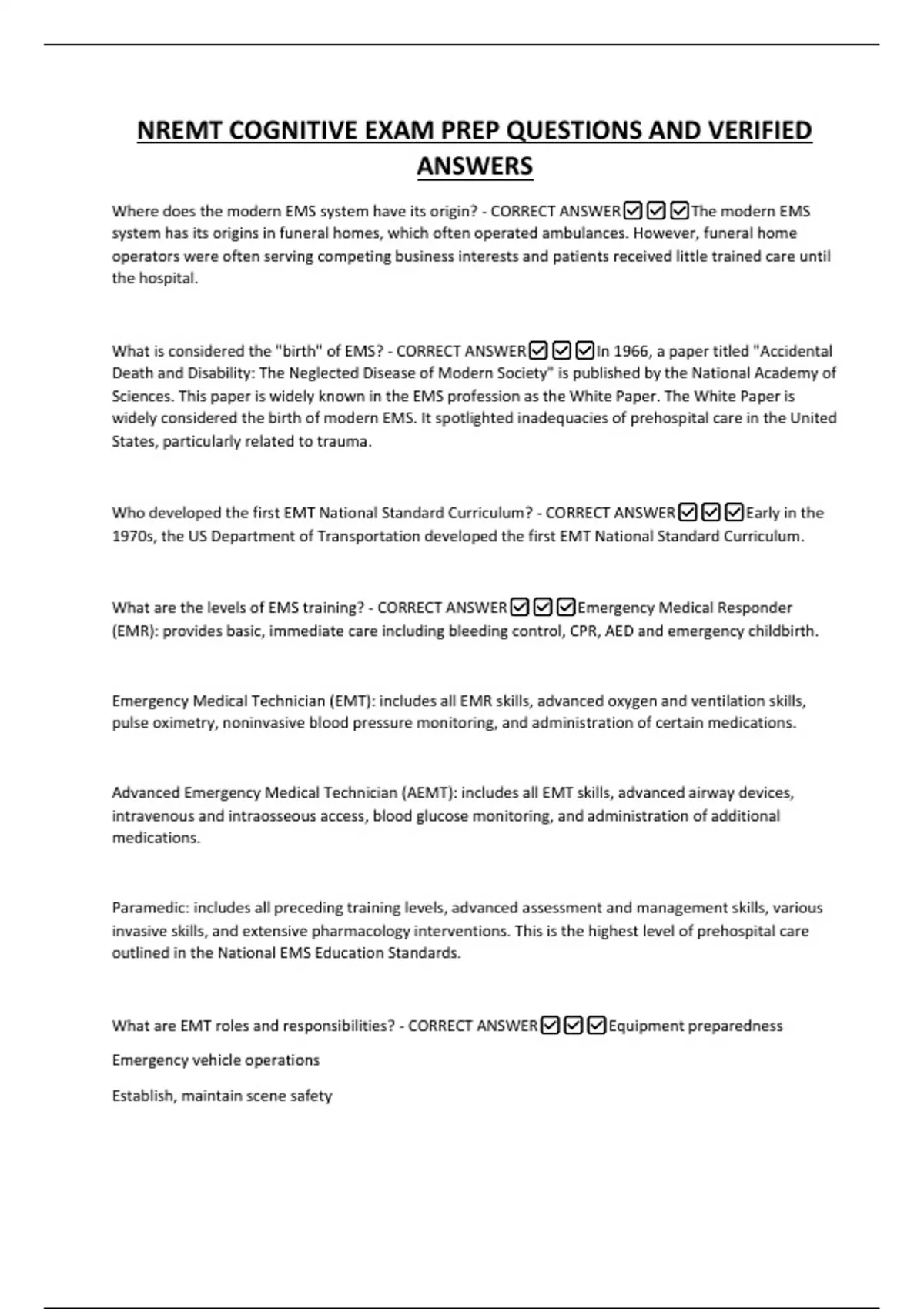 NREMT COGNITIVE EXAM PREP QUESTIONS AND VERIFIED ANSWERS Where does the modern EMS system have its origin? - CORRECT ANSWERThe modern EMS system has its origins in funeral homes, which often operated ambulances. However, funeral home operators were often serving competing business interests and patients received little trained care until the hospital.
