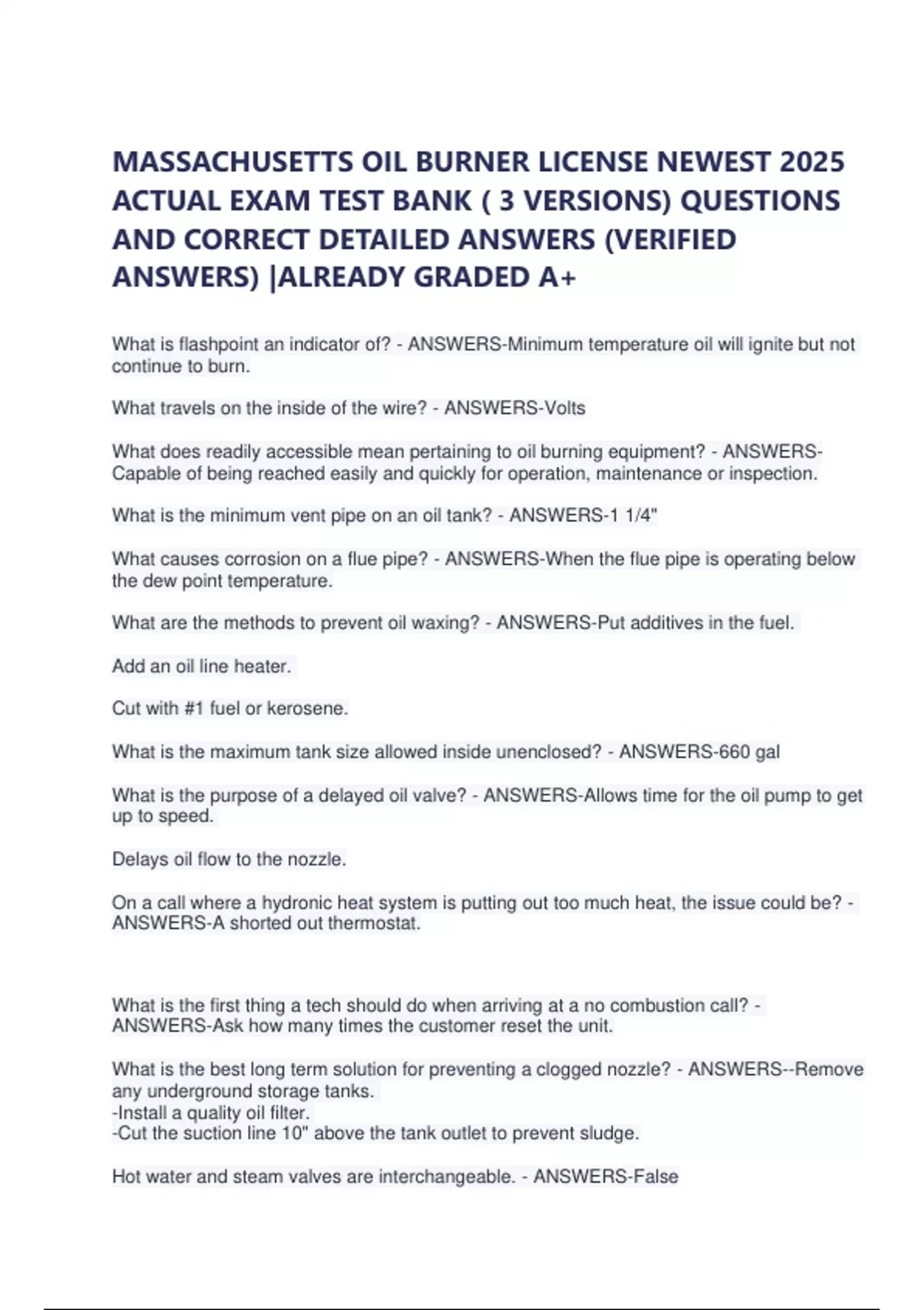 MASSACHUSETTS OIL BURNER LICENSE NEWEST 2025 ACTUAL EXAM TEST BANK ( 3 VERSIONS) QUESTIONS AND CORRECT DETAILED ANSWERS (VERIFIED ANSWERS) |ALREADY GRADED A+