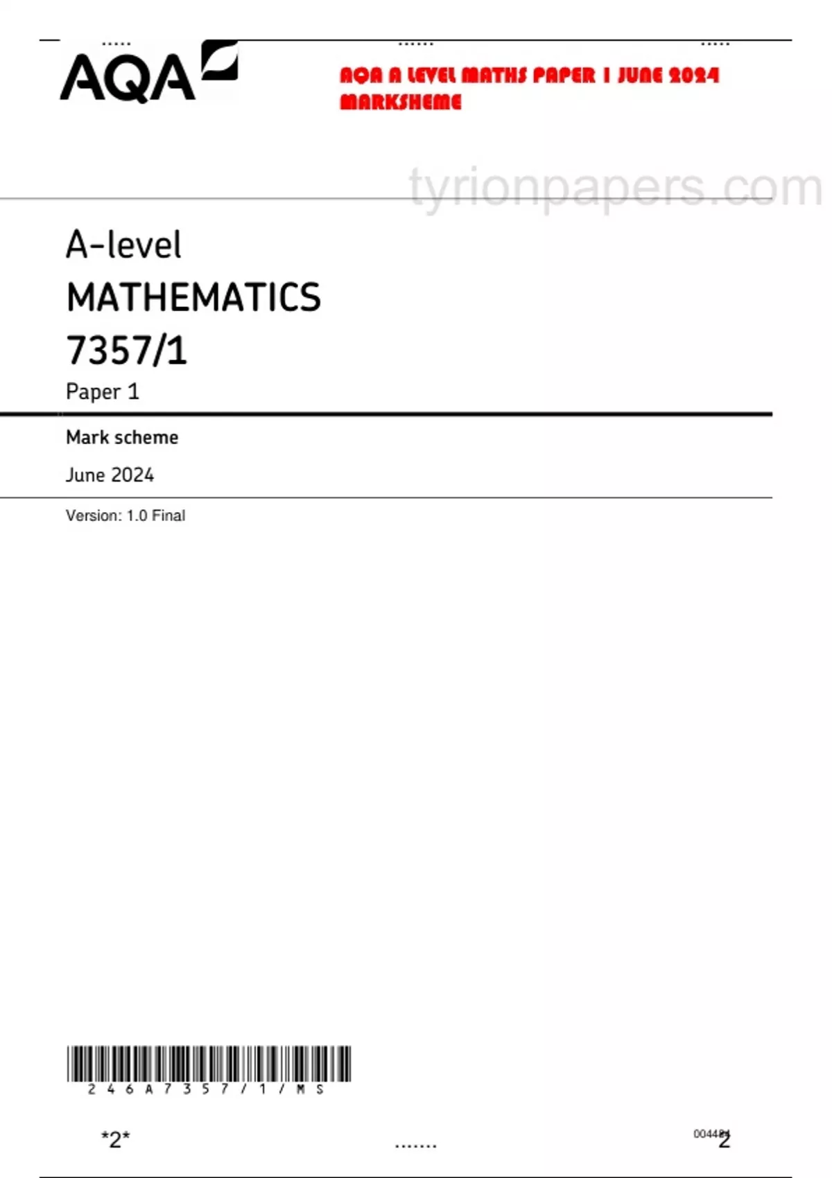 AQA A Level Maths 2024 Mark Scheme 1 (7357-1) -VERIFIED-