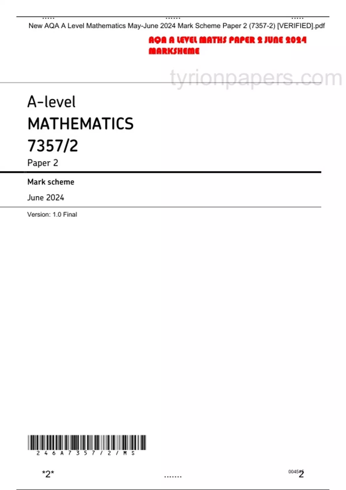 AQA A Level Maths 2024 Mark Scheme 2 (7357-2) -VERIFIED-