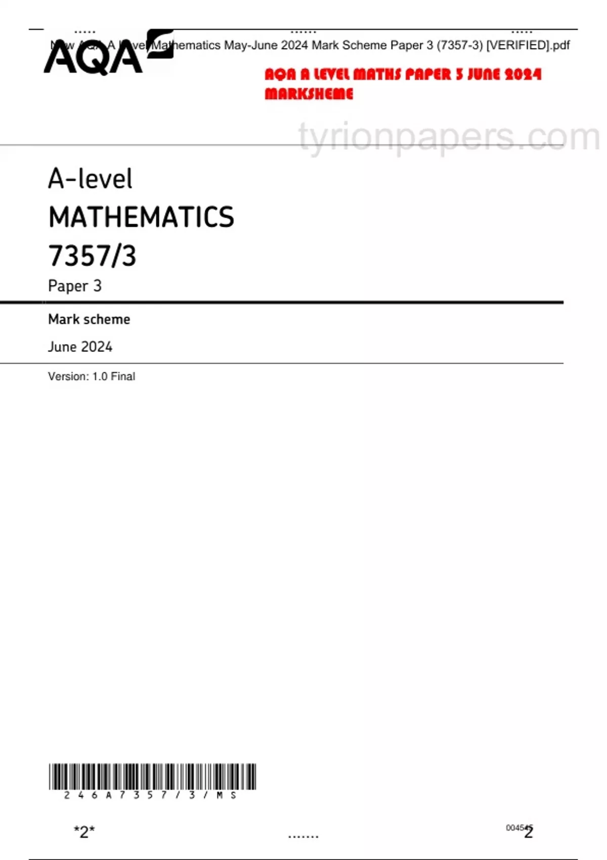 New AQA A Level Mathematics May-June 2024 Mark Scheme Paper 3 (7357-3) [VERIFIED].pdf