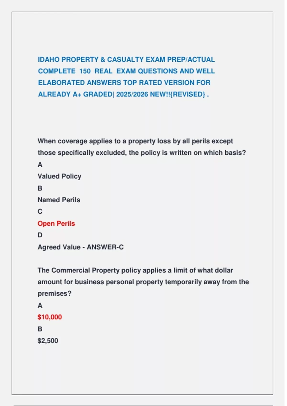 IDAHO PROPERTY & CASUALTY EXAM PREP/ACTUAL COMPLETE 150 REAL EXAM QUESTIONS AND WELL ELABORATED ANSWERS TOP RATED VERSION FOR ALREADY A+ GRADED| 2025/2026 NEW!!{REVISED} .