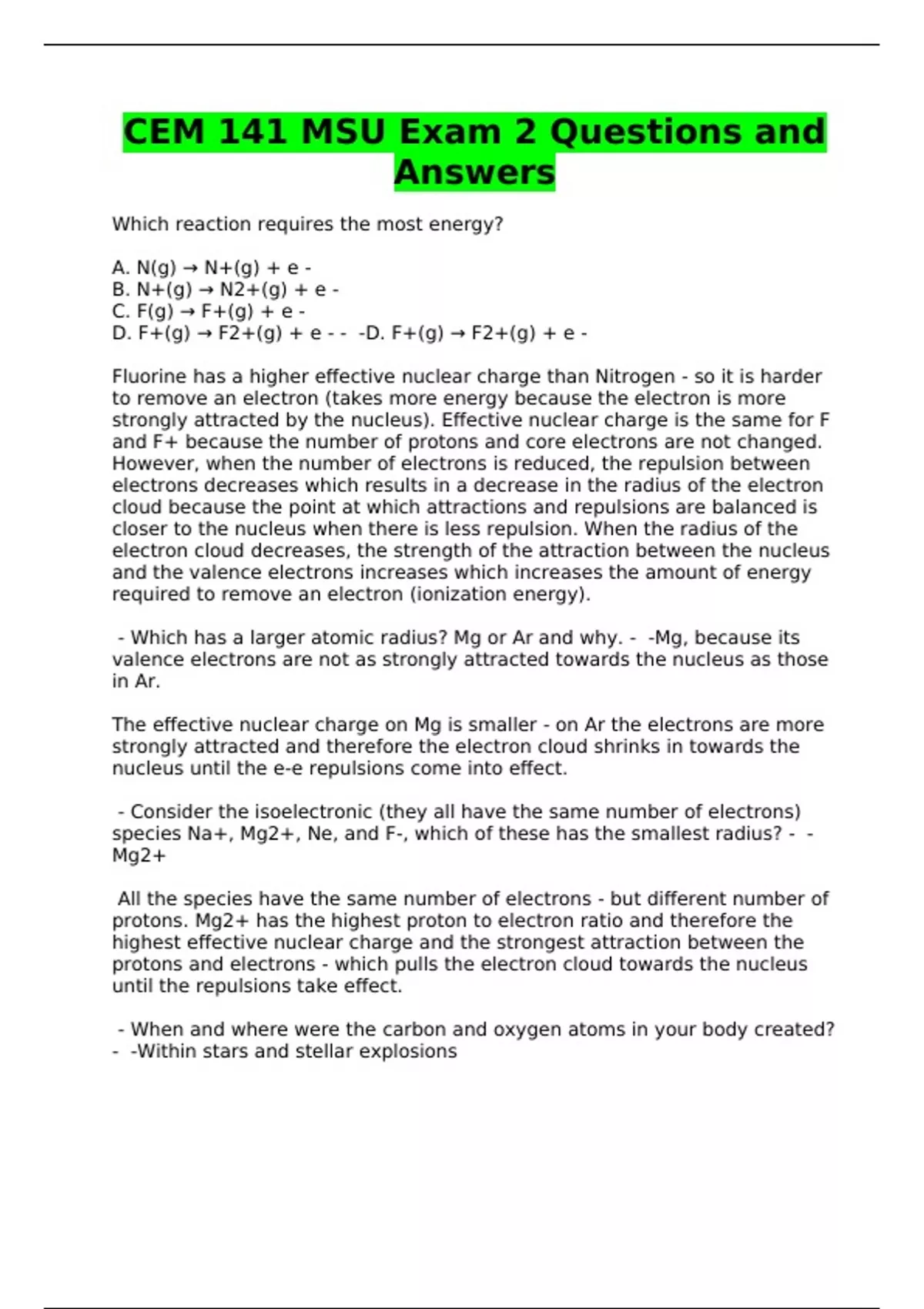 CEM 141 MSU Exam 2 Questions and