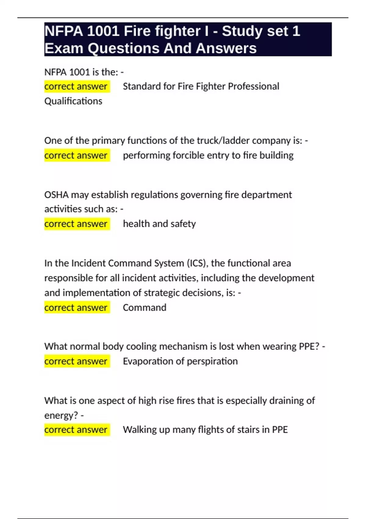 , NFPA 1001 Fire fighter I - Study set 1