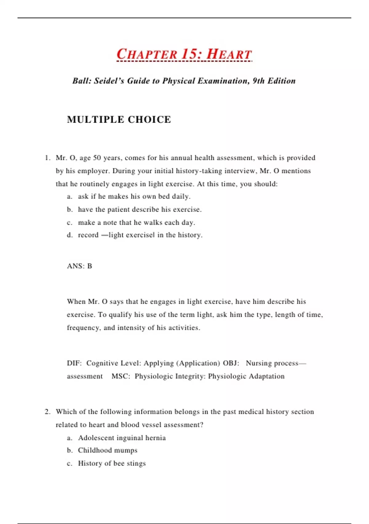 Ball: Seidel’s Guide to Physical Examination, 9th Edition MULTIPLE CHOICE 1. Mr. O, age 50 years, comes for his annual health assessment, which is provided by his employer. During your initial history-taking interview, Mr. O mentions that he routinely engages in light exercise. At this time, you should: a. ask if he makes his own bed daily. b. have the patient describe his exercise. c. make a note that he walks each day. d. record ―light exercise‖ in the history. ANS: B When Mr. O says that he engages in light exercise, have him describe his exercise. To qualify his use of the term light, ask him the type, length of time, frequency, and intensity of his activities. DIF: Cognitive Level: Applying (Application) OBJ: Nursing process—assessment MSC: Physiologic Integrity: Physiologic Adaptation 2. Which of the following information belongs in the past medical history section related to heart and blood vessel assessment? a. Adolescent inguinal hernia b. Childhood mumps c. History of bee stings d. Previous unexplained fever ANS: D Previous unexplained fever should be included in the past medical history of a heart and blood vessel assessment. This incidence may be related to acute rheumatic fever, with potential heart valve damage. DIF: Cognitive Level: Understanding (Comprehension) OBJ: Nursing process—assessment MSC: Physiologic Integrity: Physiologic Adaptation 3. A patient you are seeing in the emergency department for chest pain is believed to be having a myocardial infarction. During the health history interview of his family history, he relates that his father had died of ―heart trouble.‖ The most important follow-up question you should pose is which of the following? a. “Did your father have coronary bypass surgery?” b. “Did your father's father have heart trouble also?” c. “What were your father's usual dietary habits?” d. “What age was your father at the time of his death?”