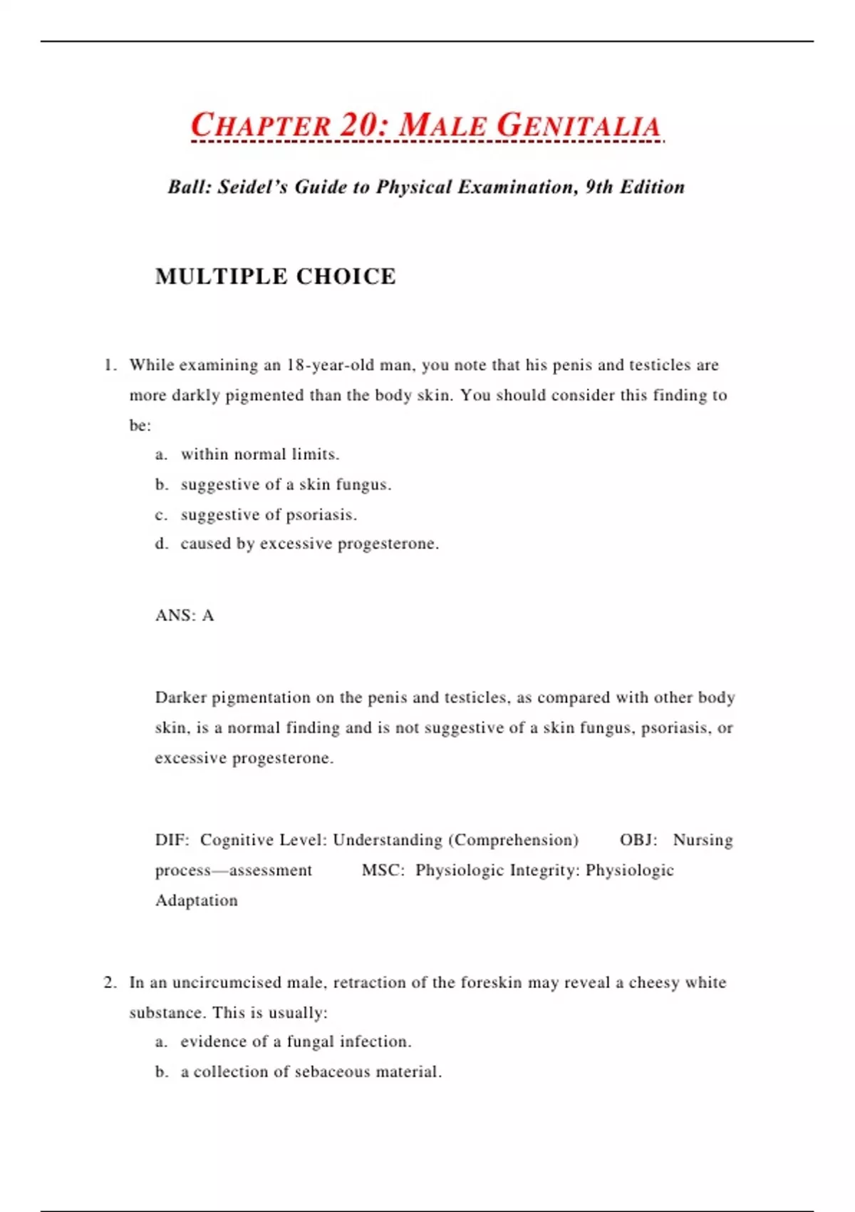 Ball: Seidel’s Guide to Physical Examination, 9th Edition MULTIPLE CHOICE 1. While examining an 18-year-old man, you note that his penis and testicles are more darkly pigmented than the body skin. You should consider this finding to be: a. within normal limits. b. suggestive of a skin fungus. c. suggestive of psoriasis. d. caused by excessive progesterone. ANS: A Darker pigmentation on the penis and testicles, as compared with other body skin, is a normal finding and is not suggestive of a skin fungus, psoriasis, or excessive progesterone. DIF: Cognitive Level: Understanding (Comprehension) OBJ: Nursing process—assessment MSC: Physiologic Integrity: Physiologic Adaptation 2. In an uncircumcised male, retraction of the foreskin may reveal a cheesy white substance. This is usually: a. evidence of a fungal infection. b. a collection of sebaceous material. c. indicative of penile carcinoma. d. suggestive of diabetes. ANS: B In the uncircumcised male, smegma is formed by the secretion of sebaceous material by the glans and the desquamation of epithelial cells from the prepuce. It appears as a cheesy white substance on the glans and in the fornix of the foreskin. Smegma lubricates the cavity between the foreskin of the penis and the glans, allowing smooth movement between them during intercourse. It is not usually evidence of a fungal infection, penile carcinoma, or diabetes. DIF: Cognitive Level: Understanding (Comprehension) OBJ: Nursing process—assessment MSC: Physiologic Integrity: Physiologic Adaptation 3. Inspection of the scrotum should reveal: a. lightly pigmented skin. b. two testes per sac. c. smooth scrotal sacs. d. the left scrotal sac lower than the right.