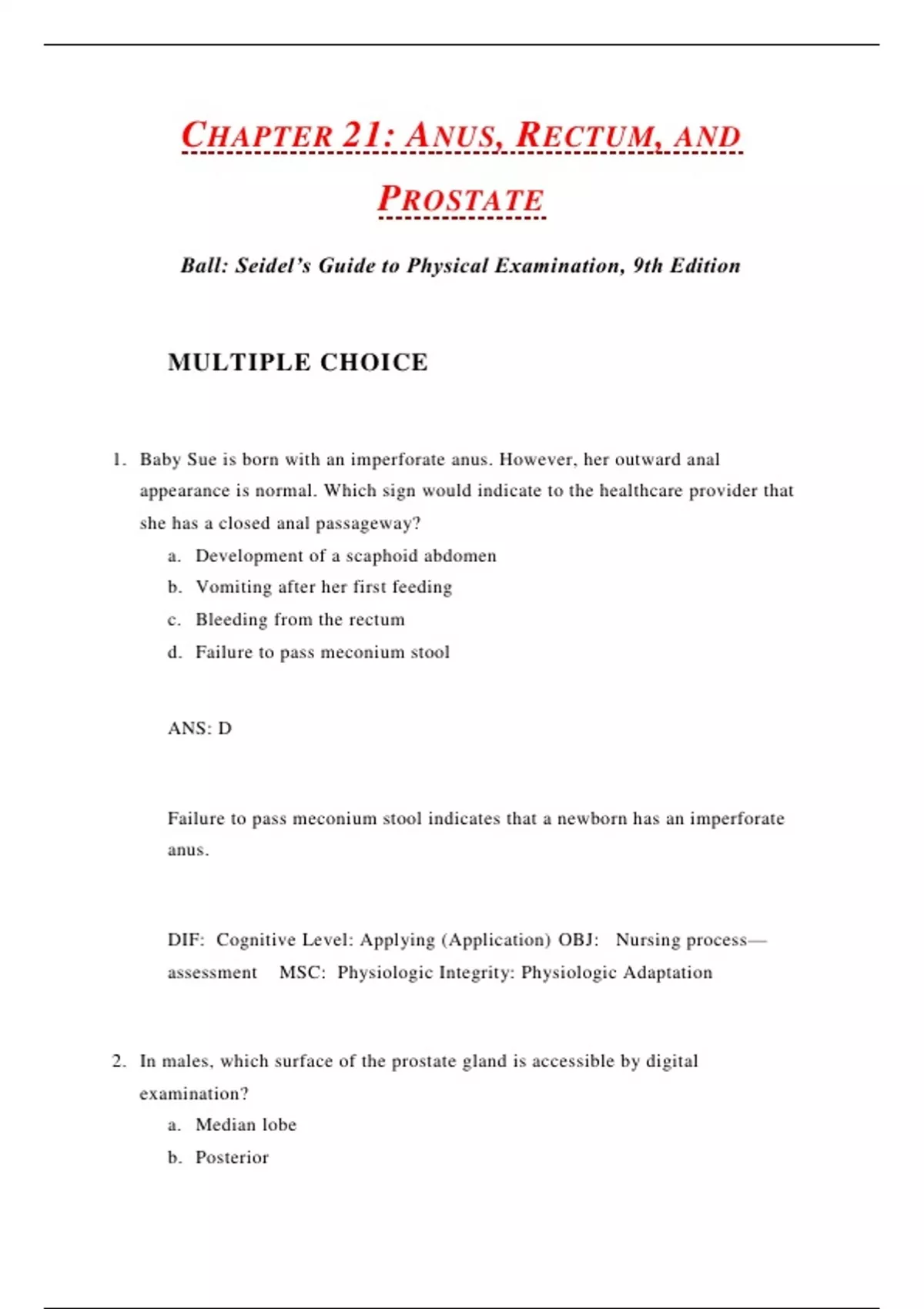 Ball: Seidel’s Guide to Physical Examination, 9th Edition MULTIPLE CHOICE 1. Baby Sue is born with an imperforate anus. However, her outward anal appearance is normal. Which sign would indicate to the healthcare provider that she has a closed anal passageway? a. Development of a scaphoid abdomen b. Vomiting after her first feeding c. Bleeding from the rectum d. Failure to pass meconium stool ANS: D Failure to pass meconium stool indicates that a newborn has an imperforate anus. DIF: Cognitive Level: Applying (Application) OBJ: Nursing process—assessment MSC: Physiologic Integrity: Physiologic Adaptation 2. In males, which surface of the prostate gland is accessible by digital examination? a. Median lobe b. Posterior c. Superior d. Anterior ANS: B The posterior surface of the prostate gland lies close to the anterior wall of the rectum and is palpable through digital rectal examination DIF: Cognitive Level: Understanding (Comprehension) OBJ: Nursing process—assessment MSC: Physiologic Integrity: Physiologic Adaptation 3. The prostatic sulcus: a. divides the right and left lateral lobes. b. is the site of the seminal vesicle emergence. c. refers to the anterior aspect of the prostate. d. secretes clear viscous mucus.