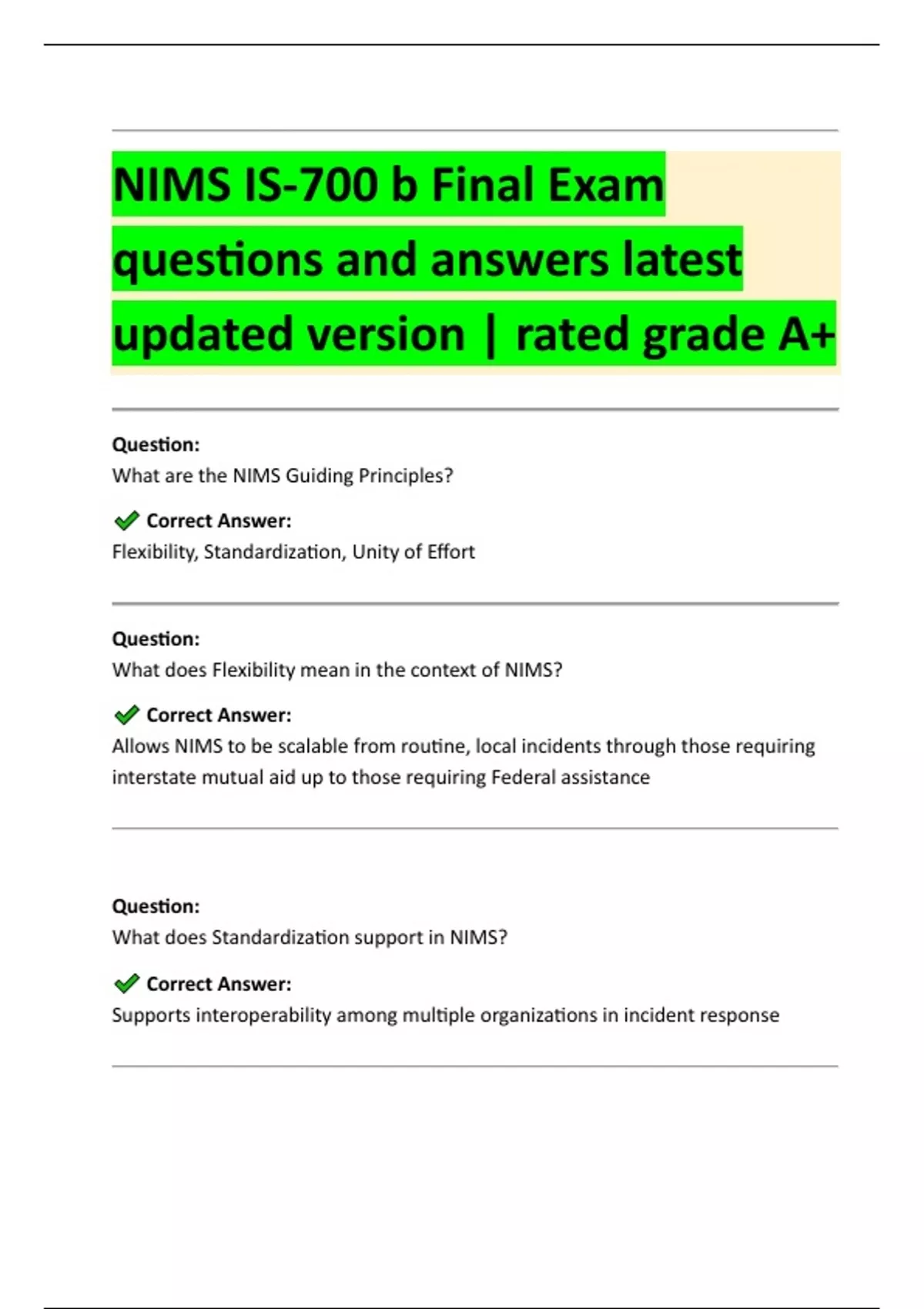 NIMS IS-700 b Final ACTUAL EXAM QUESTIONS AND CORRECT DETAILED ANSWERS (VERIFIED ANSWERS) ||ALREADY GRADED A+||NEWEST VERSION( 2025/2026) Question: What are the NIMS Guiding Principles? ️ Correct Answer: Flexibility, Standardization, Unity of Effort ________________________________________ Question: What does Flexibility mean in the context of NIMS? ️ Correct Answer: Allows NIMS to be scalable from routine, local incidents through those requiring interstate mutual aid up to those requiring Federal assistance ________________________________________ Question: What does Standardization support in NIMS? ️ Correct Answer: Supports interoperability among multiple organizations in incident response ________________________________________ Question: What is the purpose of Standard Organizational Structures in NIMS? ️ Correct Answer: Improve integration and connectivity among organizations ________________________________________ Question: What do Standard Practices enable in NIMS? ️ Correct Answer: Allow incident personnel and organizations to work together effectively ________________________________________ Question: Why is Common Terminology important in NIMS? ️ Correct Answer: Enables effective communication ________________________________________ Question: What is the purpose of Unity of Effort in NIMS? ️ Correct Answer: Enables organizations with jurisdictional authority or functional responsibilities to support each other while allowing each participating agency to maintain its own authority and accountability ________________________________________ Question: What are the 3 Major Components of NIMS? ️ Correct Answer: 1. Resource Management 2. Command and Coordination 3. Communications and Information Management ________________________________________ Question: What is Resource Management in NIMS? ️ Correct Answer: Standard mechanisms to systematically manage resources, including personnel, equipment, supplies, teams, and facilities, both before and during incidents to allow organizations to more effectively share resources when needed ________________________________________ Question: What does Command and Coordination describe in NIMS? ️ Correct Answer: Describes leadership roles, processes, and recommended organizational structures for incident management at the operational and incident support levels and explains how these structures interact to manage incidents effectively and efficiently ________________________________________ Question: What does Communications and Information Management cover in NIMS? ️ Correct Answer: Describes systems and methods that help to ensure that incident personnel and other decision makers have the means and information they need to make and communicate decisions ________________________________________ Question: What are the 4 Key Activities of Resource Management Preparedness? ️ Correct Answer: 1. Identifying and typing resources 2. Qualifying, certifying, and credentialing personnel 3. Planning for resources 4. Acquiring, storing, and inventorying resources