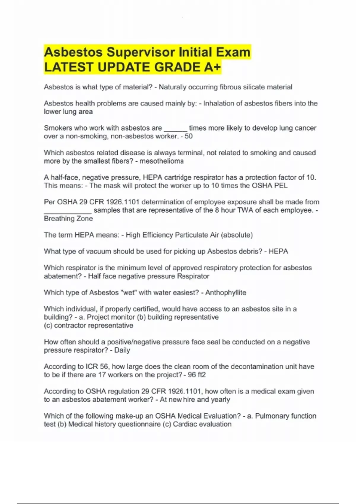 Asbestos Supervisor Initial Exam LATEST UPDATE GRADE A+ Asbestos Supervisor Initial Exam LATEST UPDATE GRADE A+