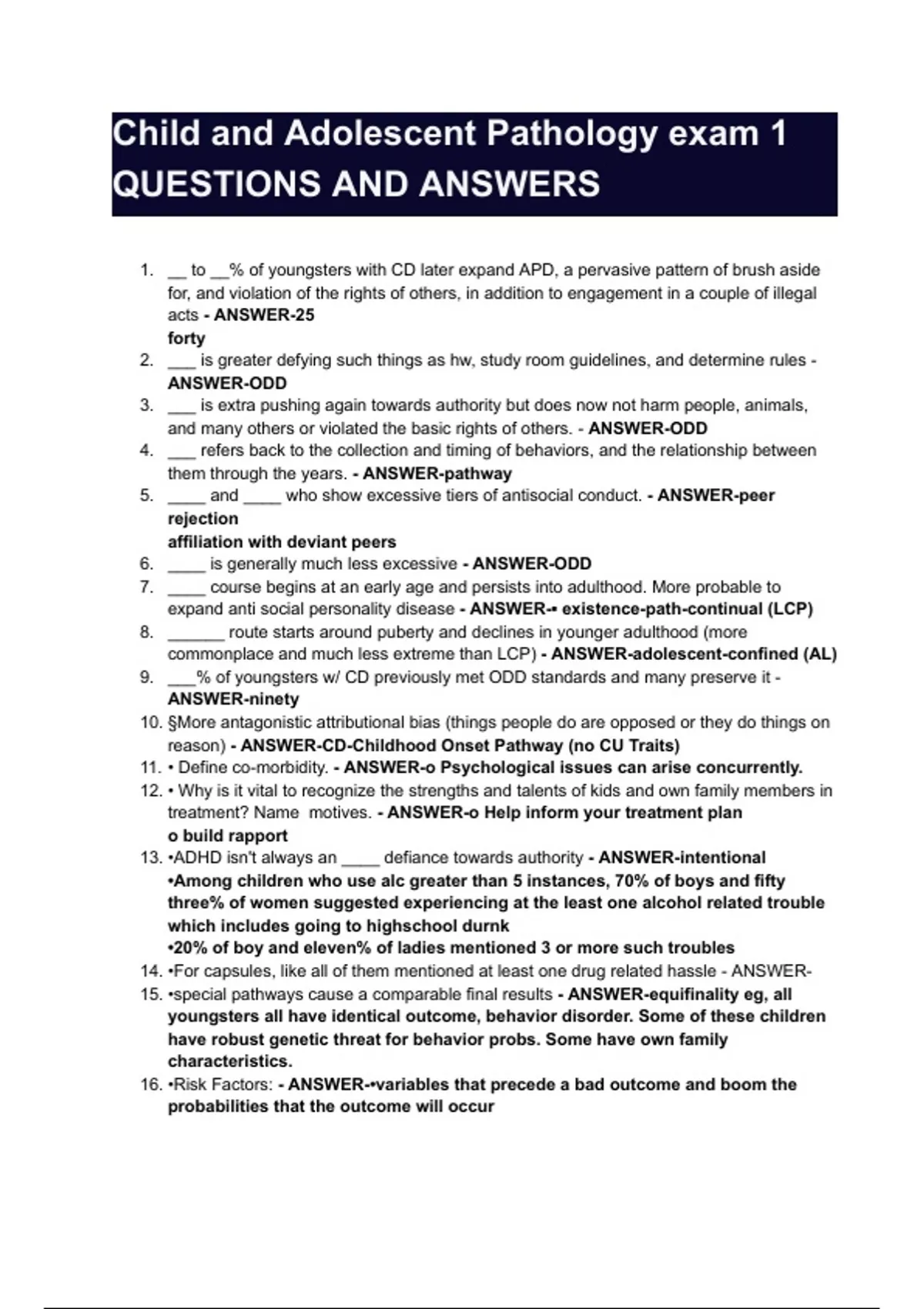Child and Adolescent Pathology exam 1 QUESTIONS AND ANSWERS