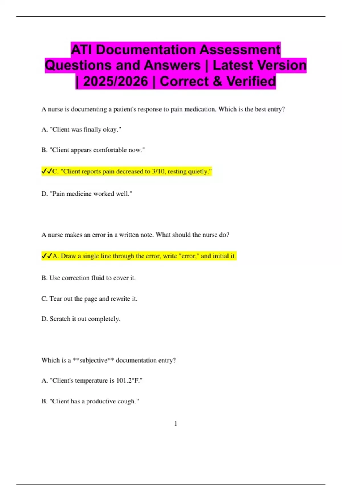 ✔✔C. "Client reports pain decreased to 3/10, resting quietly."