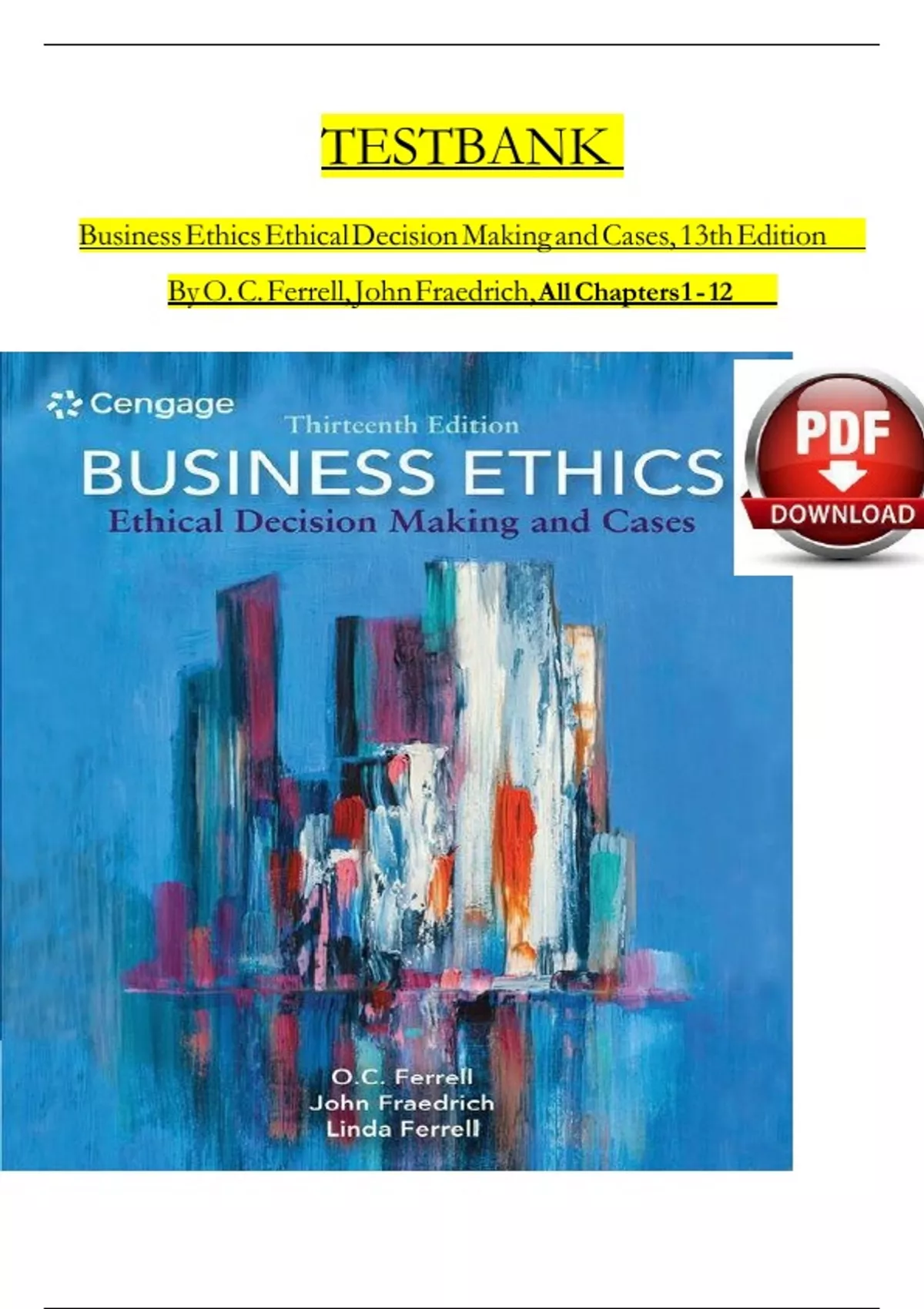 Test Bank For Business Ethics Ethical Decision Making and Cases, 13th Edition By O. C. Ferrell, John Fraedrich, Ferrell TABLE OF CONTENTS Part 1: An Overview of Business Ethics 1: The Importance of Business Ethics 2: Stakeholder Relationships, Social Responsibility, and Corporate Governance 3: Sustainability: Ethical and Social Responsibility Dimensions Part 2: Ethical Issues and the Institutionalization of Business Ethics 4: The Institutionalization of Business Ethics 5: Emerging Business Ethics Issues Part 3: The Decision-Making Process 6: Ethical Decision Making 7: Individual Factors: Moral Philosophies and Values 8: Organizational Factors: The Role of Ethical Culture and Relationships Part 4: Implementing Business Ethics in a Global Economy 9: Developing and Implementing an Effective Ethics Program 10: Global Business Ethics Issues 11: Ethical Leadership 12: Technology: Ethics and Social Responsibility Issues 2025