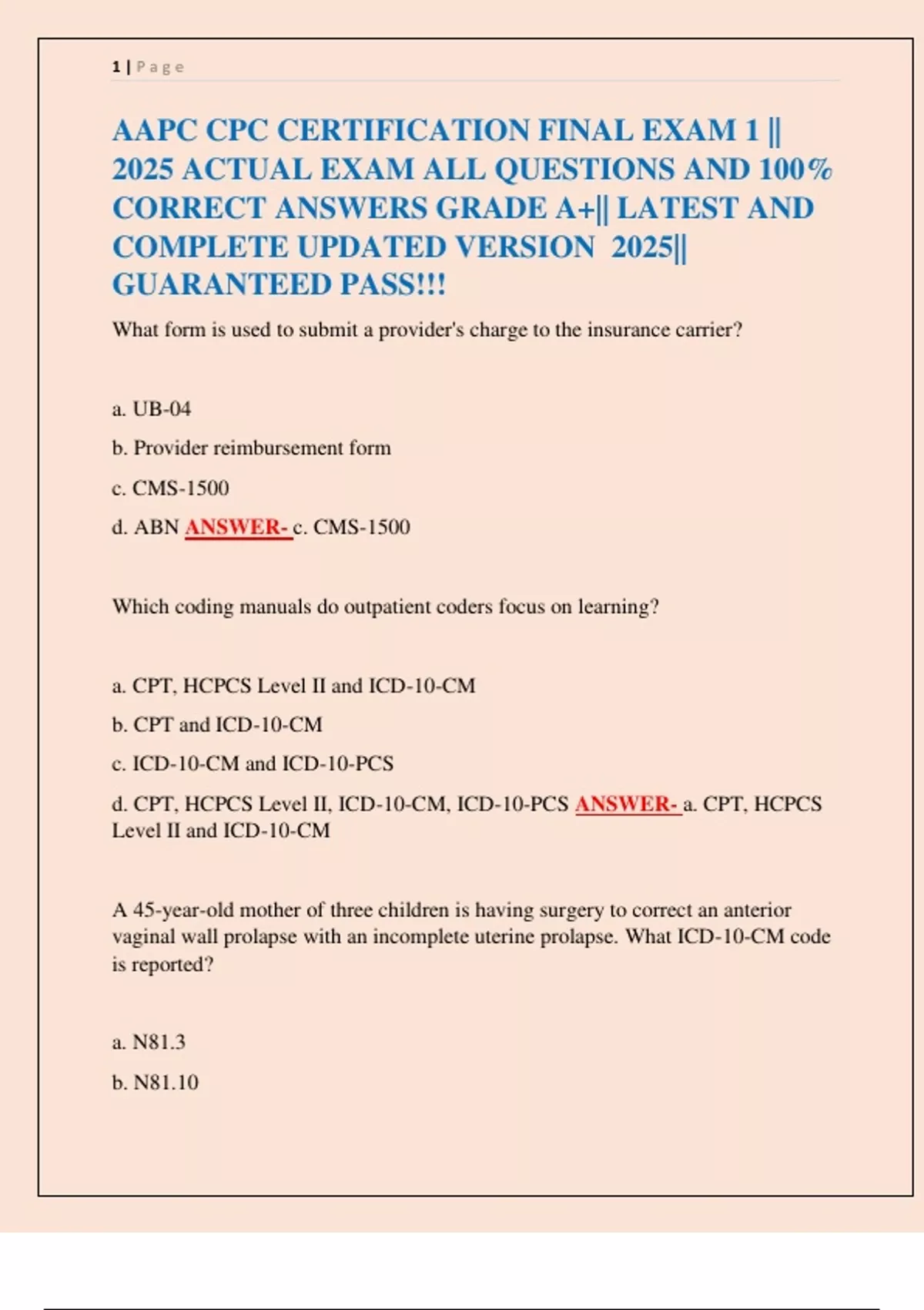 AAPC CPC CERTIFICATION FINAL EXAM 1 || 2025 ACTUAL EXAM ALL QUESTIONS AND 100% CORRECT ANSWERS GRADE A+|| LATEST AND COMPLETE UPDATED VERSION 2025|| GUARANTEED PASS!!!