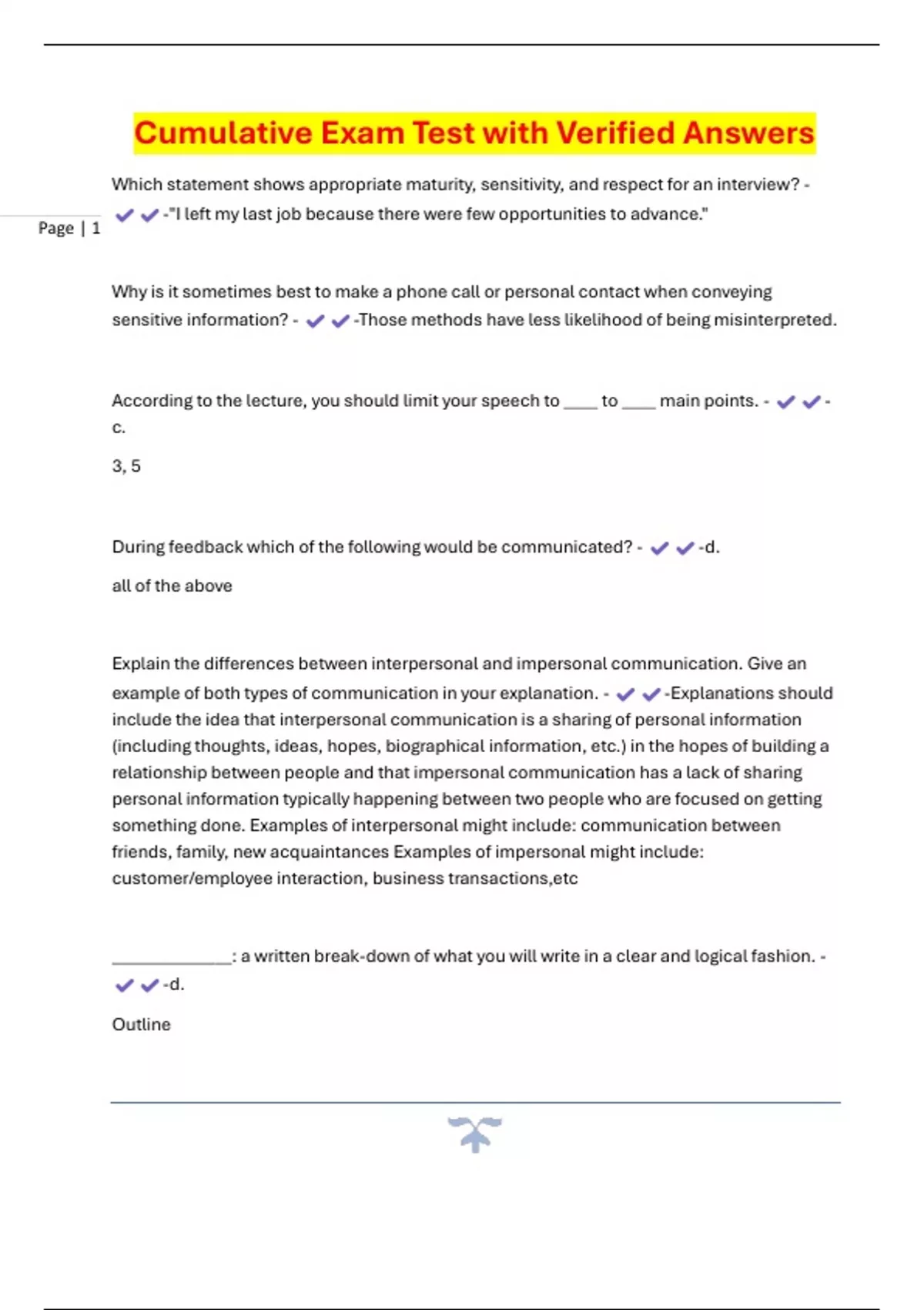 Cumulative Exam Test with Verified Answers Which statement shows appropriate maturity, sensitivity, and respect for an interview? - -"I left my last job because there were few opportunities to advance." Why is it sometimes best to make a phone call or personal contact when conveying sensitive information? - -Those methods have less likelihood of being misinterpreted. According to the lecture, you should limit your speech to ____ to ____ main points. - - c. 3, 5 During feedback which of the following would be communicated? - -d. all of the above Explain the differences between interpersonal and impersonal communication. Give an example of both types of communication in your explanation. - -Explanations should include the idea that interpersonal communic