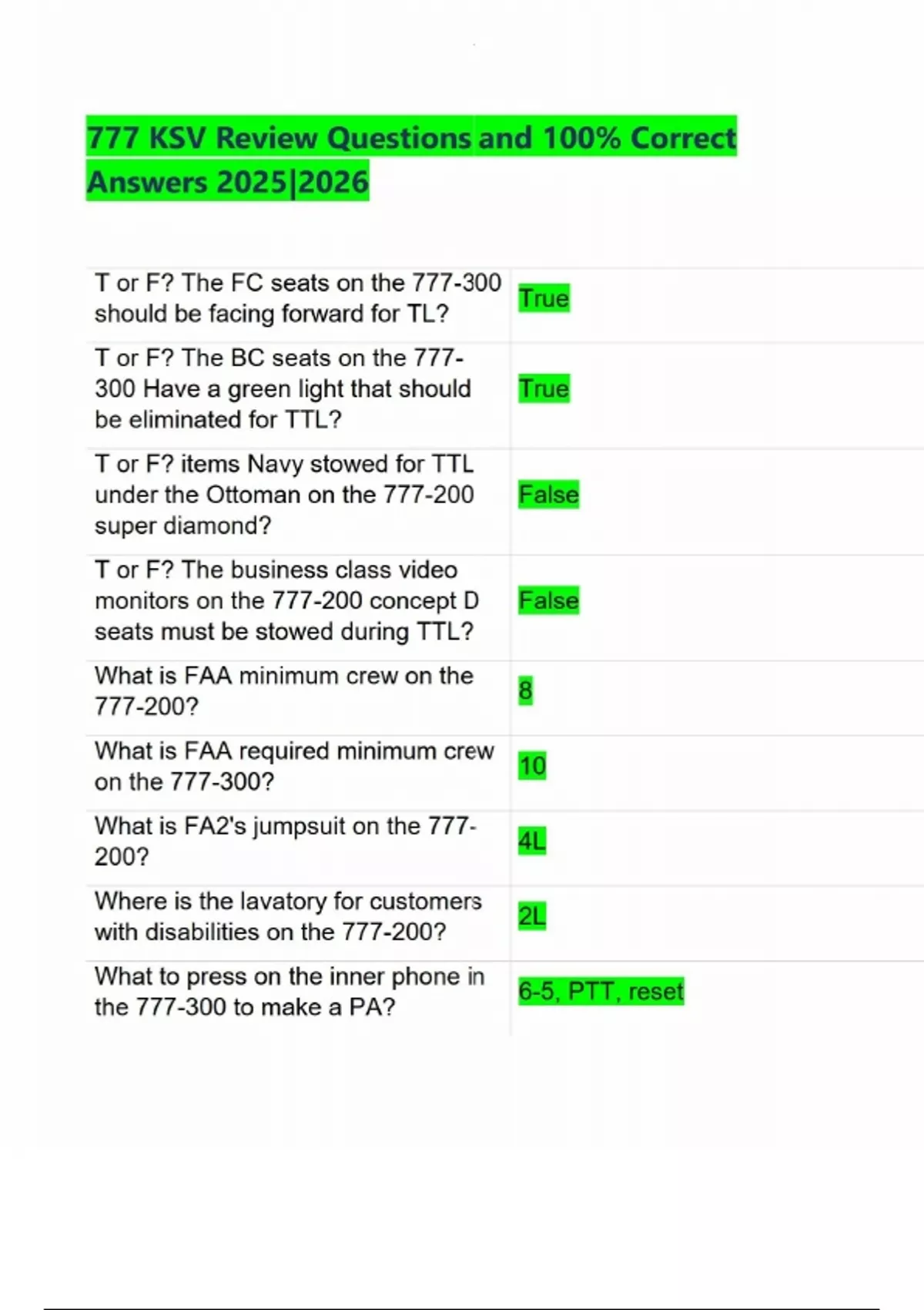 777 KSV Review Questions and 100% Correct Answers 2025|2026 T or F? The FC seats on the 777-300 should be facing forward for TL? True T or F? The BC seats on the 777-300 Have a green light that should be eliminated for TTL? True T or F? items Navy stowed for TTL under the Ottoman on the 777-200 super diamond? False T or F? The business class video monitors on the 777-200 concept D seats must be stowed during TTL? False What is FAA minimum crew on the 777-200? 8 What is FAA required minimum crew on the 777-300? 10 What is FA2's jumpsuit on the 777-200? 4L Where is the lavatory for customers with disabilities on the 777-200? 2L What to press on the inner phone in the 777-300 to make a PA? 6-5, PTT, reset