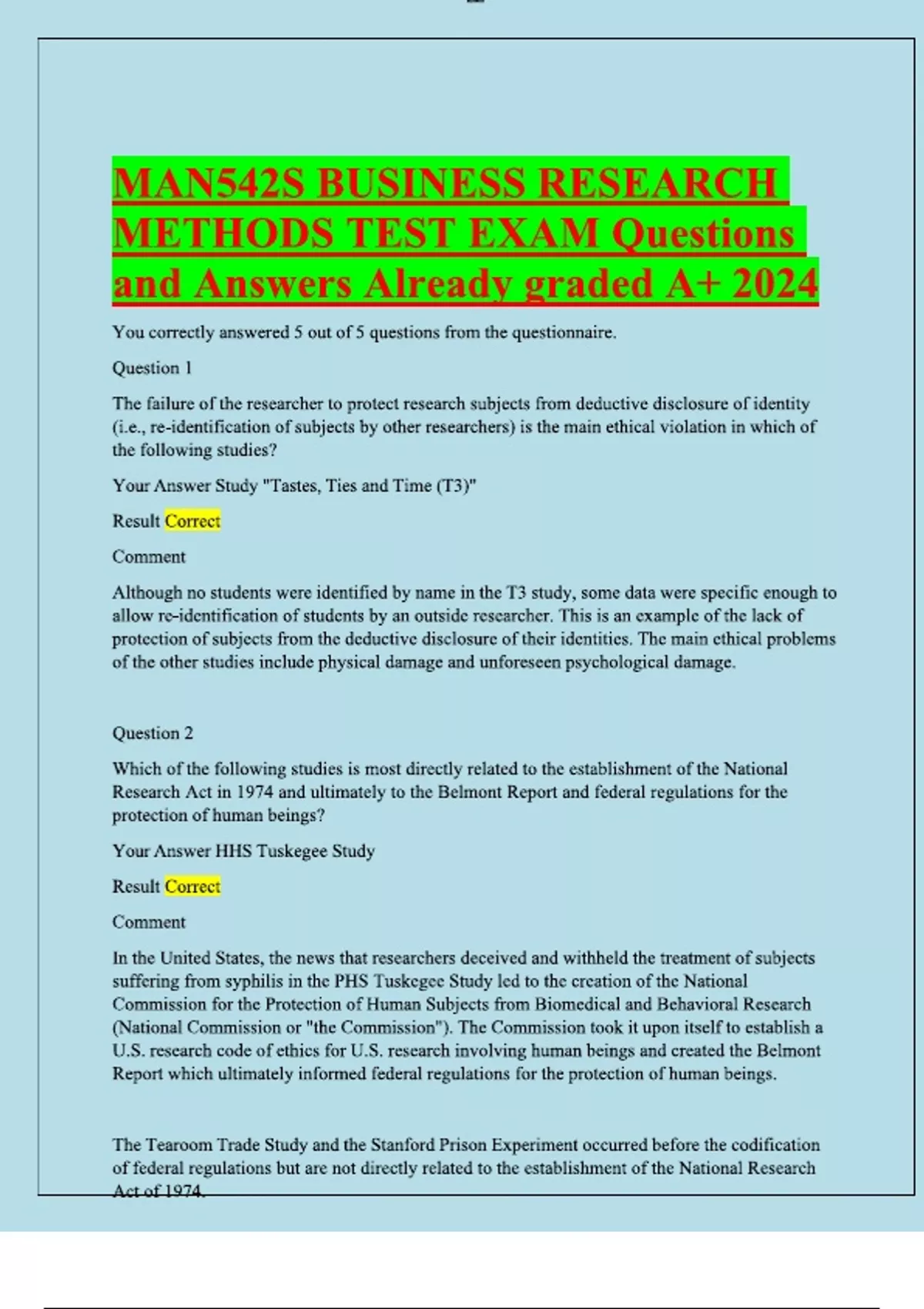 MAN542S BUSINESS RESEARCH METHODS TEST EXAM Questions and Answers Already graded A+ 2024