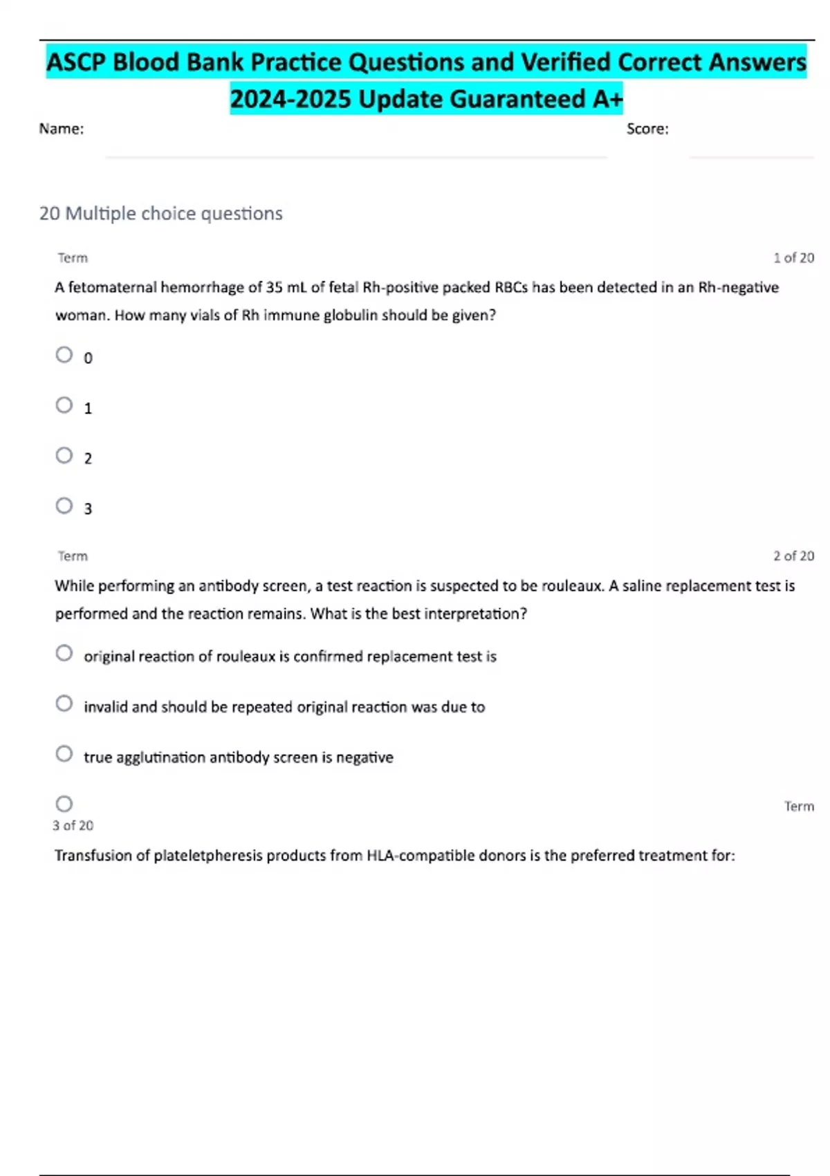 ASCP Blood Bank Practice Questions and Verified Correct Answers Update Guaranteed A+ASCP Blood Bank Practice Questions and Verified Correct Answers Update Guaranteed A+ASCP Blood Bank Practice Questions and Verified Correct Answers Update Guaranteed A+ASCP Blood Bank Practice Questions and Verified Correct Answers Update Guaranteed A+ASCP Blood Bank Practice Questions and Verified Correct Answers Update Guaranteed A+ASCP Blood Bank Practice Questions and Verified Correct Answers Update Guaranteed A+