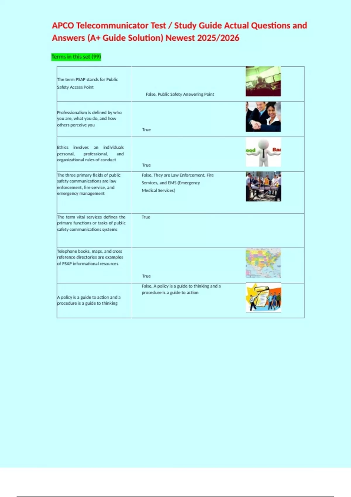 APCO Telecommunicator Test / Study Guide Actual Questions and Answers (A+ Guide Solution) Newest 2025/2026 Terms in this set (99) The term PSAP stands for Public Safety Access Point False, Public Safety Answering Point Professionalism is defined by who you are, what you do, and how others perceive you True Ethics involves an individuals personal, professional, and organizational rules of conduct True The three primary fields of public safety communications are law enforcement, fire service, and emergency management False, They are Law Enforcement, Fire Services, and EMS (Emergency Medical Services) The term vital services defines the primary functions or tasks of public safety communications systems True Telephone books, maps, and cross reference directories are examples of PSAP informational resources True A policy is a guide to action and a procedure is a guide to thinking False, A policy is a guide to thinking and a procedure is a guide to action