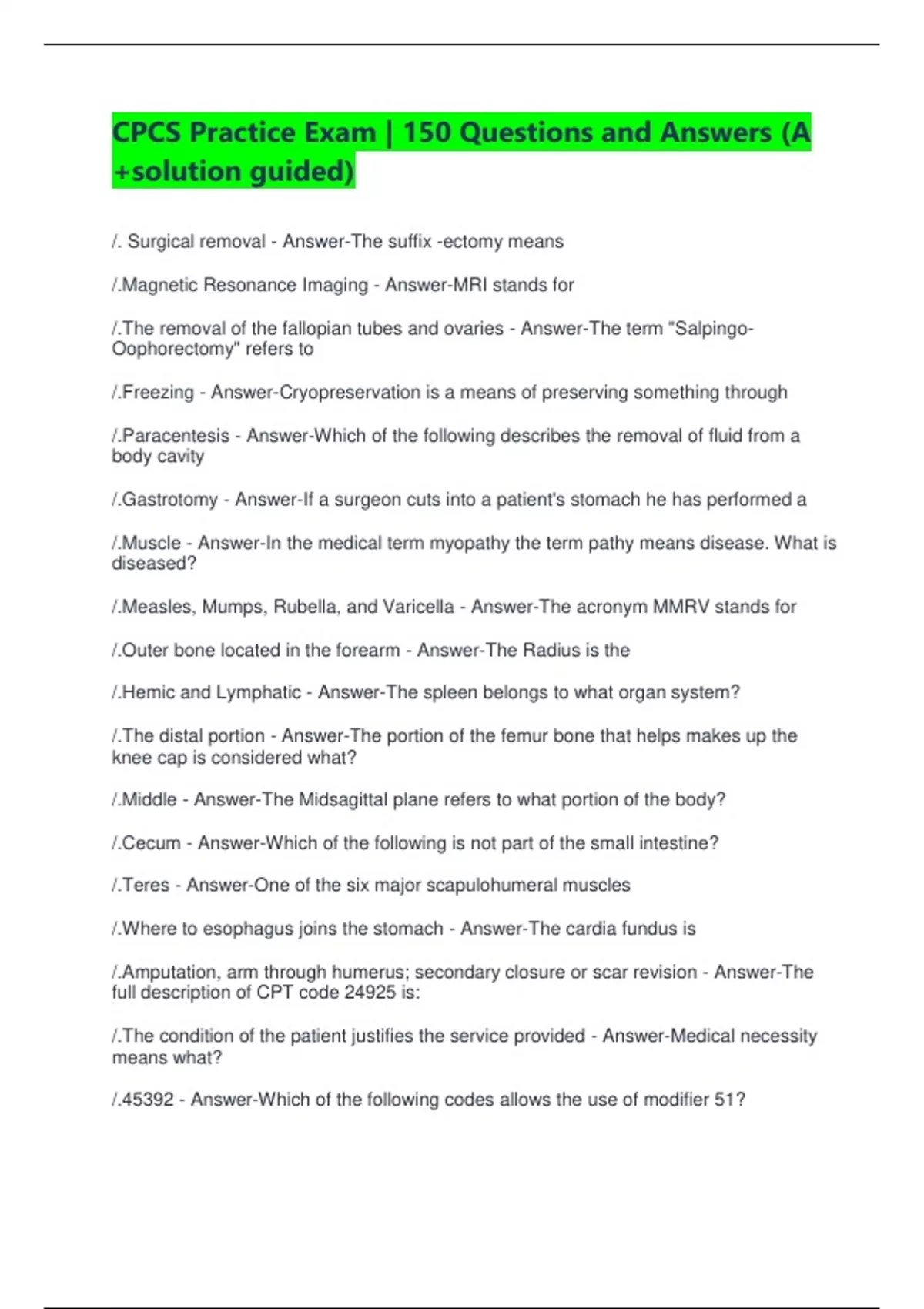 CPCS Practice Exam | 150 Questions and Answers (A +solution guided) /. Surgical removal - Answer-The suffix -ectomy means /.Magnetic Resonance Imaging - Answer-MRI stands for /.The removal of the fallopian tubes and ovaries - Answer-The term "Salpingo-Oophorectomy" refers to /.Freezing - Answer-Cryopreservation is a means of preserving something through /.Paracentesis - Answer-Which of the following describes the removal of fluid from a body cavity /.Gastrotomy - Answer-If a surgeon cuts into a patient's stomach he has performed a /.Muscle - Answer-In the medical term myopathy the term pathy means disease. What is diseased? /.Measles, Mumps, Rubella, and Varicella - Answer-The acronym MMRV stands for /.Outer bone located in the forearm - Answer-The Radius is the /.Hemic and Lymphatic - Answer-The spleen belongs to what organ system? /.The distal portion - Answer-The portion of the femur bone that helps makes up the knee cap is considered what? /.Middle - Answer-The Midsagittal plane refers to what portion of the body? /.Cecum - Answer-Which of the following is not part of the small intestine? /.Teres - Answer-One of the six major scapulohumeral muscles /.Where to esophagus joins the stomach - Answer-The cardia fundus is /.Amputation, arm through humerus; secondary closure or scar revision - Answer-The full description of CPT code 24925 is: /.The condition of the patient justifies the service provided - Answer-Medical necessity means what? /.45392 - Answer-Which of the following codes allows the use of modifier 51? /.It helps cover outpatient charges - Answer-Which of the following statements is not true regarding Medicare Part A /.External cause codes are only used in the initial encounter. - Answer-Which of the following statements is false? /.Exploration, including enlargement, debridement, removal of foreign body(ies), minor vessel ligation, and repair - Answer-Wound exploration codes include the following service (s) : /.I12.9, N18.3 - Answer-What is the correct ICD-10-CM code(s) for malignant hypertension with stage III kidney disease? /.S51.822A, W07.XXXA, W25.XXXA, Y93.E9, Y92.030 - Answer-Lucy was standing on a chair in her apartment's kitchen trying to change a light bulb when she slipped and fell. She struck the glass top stove, which shattered. She presents to the ER with a simple laceration to her left forearm that has embedded glass particles. Which is the correct code(s)? /.T20.30XA, T24.319A, T22.299A, T31.42, X03.0XXA - Answer-Jim was at a bonfire when he tripped and fell into the flames and sustained multiple burns. He came to the emergency room via an ambulance and was treated for second and third degree burns on his face, second degree burns on his upper arms and forearms, and third degree burns on the fronts of his thighs Which is the correct code(s)? /.O63.0, O09.513, Z37.0 - Answer-. A 35 year old woman who is pregnant in her 38th week with her first child is admitted to the hospital. She experiences a prolonged labor during the first stage and eventually births a healthy baby boy. Which is the correct code(s)? /.S62.632A, Y93.64, W51.XXXA, Y92.320 - Answer-Henry was playing baseball at the town's sports field and slid for home base where he collided with another player. He presents to the emergency department complaining of pain in the distal portion of his right middle finger. It is swollen and deformed. The physician orders an x-ray and diagnoses Henry with a displaced tuft fracture. He splints the finger, provides narcotics for pain, and instructs Henry to follow-up with his orthopedist in two weeks. Which is the correct code(s)? /.F15.20, F10.20, F41.1, F43.10 - Answer-A 60 year old male is admitted for detoxification and rehabilitation. He has continuously abused amphetamines to the point that he cannot voluntarily stop on his own and has become dependent upon them. He also has a long documented history of alcohol abuse and alcoholism. He experiences high levels of anxiety due to PTSD, which causes him to use and abuse substances. Which is the correct code(s)? /.E11.319 - Answer-A patient with uncontrolled type II diabetes is experiencing blurred vision and an increase in floaters appearing in her vision. She is diagnosed with diabetic retinopathy. Which is the correct code(s)? /.Z21 - Answer-A patient who is known to be HIV positive but who has no documented symptoms would be assigned code /.L55.1 - Answer-A patient fell asleep on the beach and comes in with blistering on her back. She is diagnosed with second degree solar radiation burns. Which is the correct code(s)? /.True - Answer-Signs and symptoms that are associated routinely with a disease process should not be assigned as additional codes, unless otherwise instructed by classification. /.A6252, A6219 - Answer-A patient has a home health aide come to his home to clean and dress a burn on his lower leg. The aide uses a special absorptive, sterile dressing to cover a 20 sq. cm. area. She also covers a 15sq. cm. area with a self-adhesive sterile gauze pad. /.Q4010 - Answer-A 12 year old arrives in his pediatrician's office after colliding with another player during a soccer game. He is complaining of pain in his right wrist. The physician orders an x-ray and diagnoses him with a hairline fracture of the distal radius. He has a short arm fiberglass cast applied and discharges him with follow up instructions. /.J9070 - Answer-A patient with Hodgkin's disease takes Neosar as part of his chemotherapy regiment. He receives 100 mg once a week through intravenous infusion. Which is the correct code(s)? /.A5500-A5513 - Answer-A patient with diabetes is fitted for custom molded shoes. What is the code range for such a fitting? Which is the correct code(s)? /.E1222 - Answer-A 300lb. paraplegic needs a special sized wheelchair with fixed arm rests and elevating leg rests. Which is the correct code(s)? /.99211 - Answer-A patient comes into her doctor's office for her weekly blood sugar check. Her blood is drawn by t