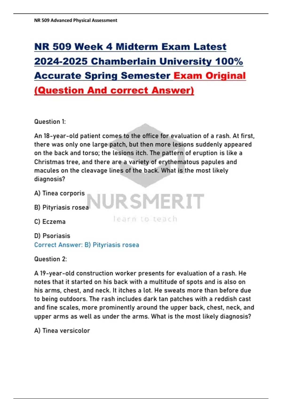 NR 509 Week 4 Midterm Exam Latest Chamberlain University 100% Accurate Spring Semester Exam Original (Question And correct Answer)