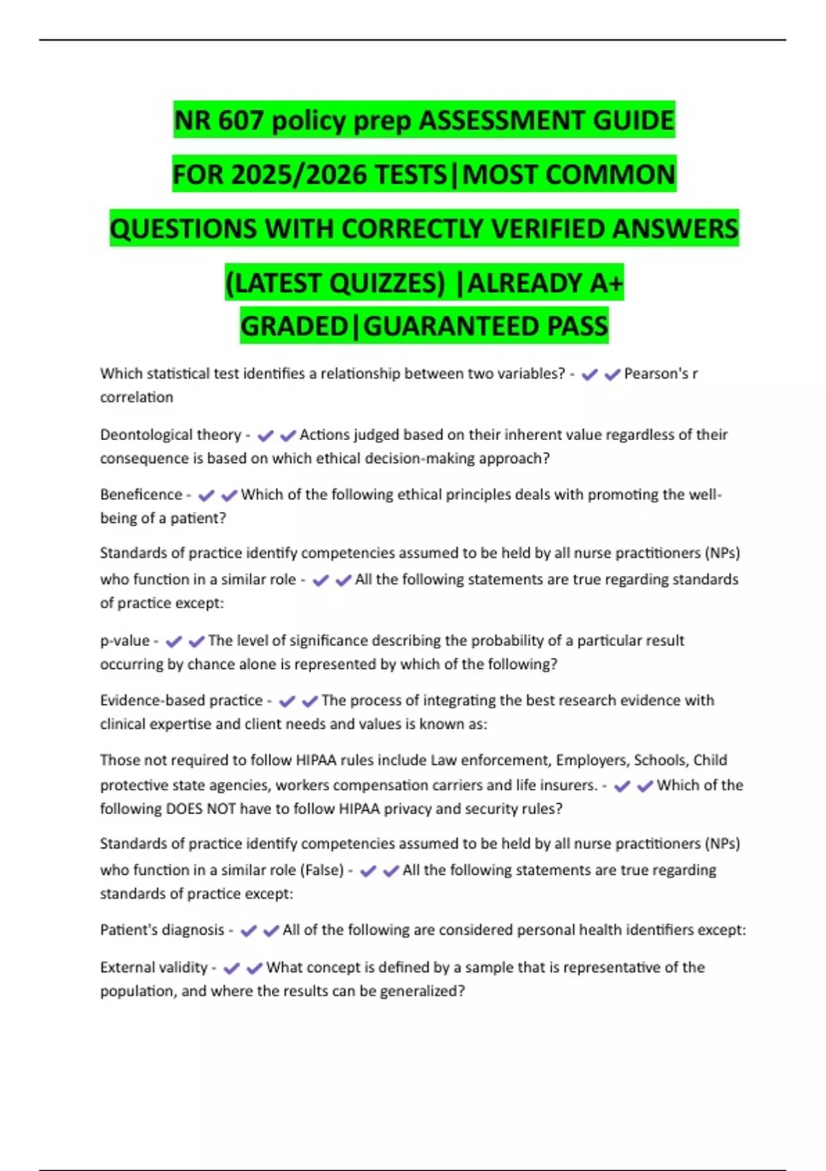 NR 607 policy prep ASSESSMENT GUIDE FOR 2025/2026 TESTS|MOST COMMON QUESTIONS WITH CORRECTLY VERIFIED ANSWERS (LATEST QUIZZES) |ALREADY A+ GRADED|GUARANTEED PASS