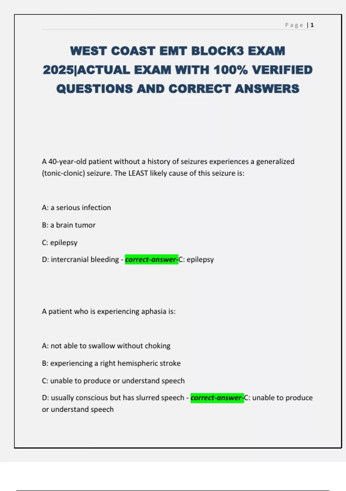 WEST COAST EMT BLOCK3 EXAM 2025|ACTUAL EXAM WITH 100% VERIFIED QUESTIONS AND CORRECT ANSWERS