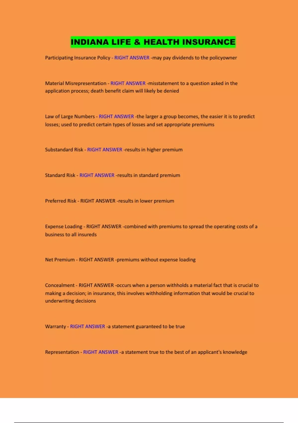 Representation - RIGHT ANSWER -a statement true to the best of an applicant's knowledge