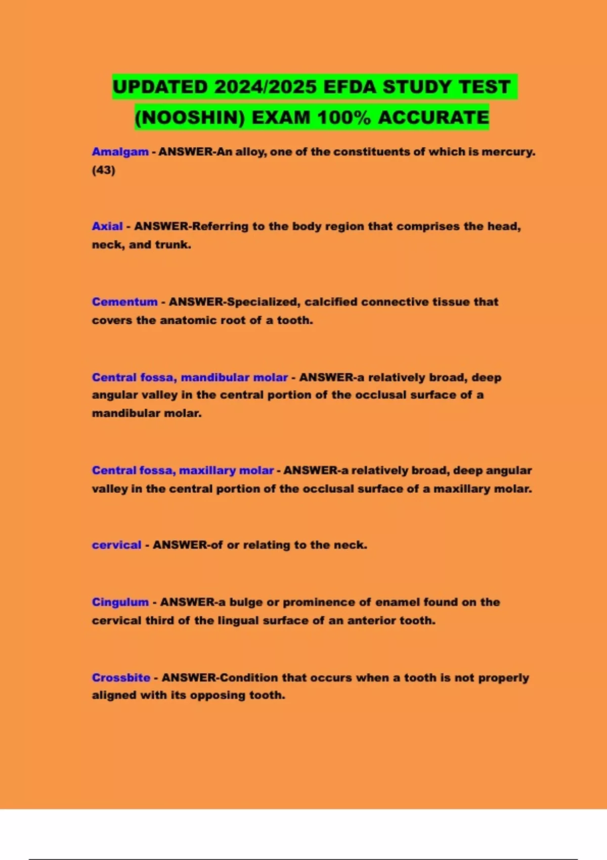 UPDATED 2024/2025 EFDA STUDY TEST (NOOSHIN) EXAM 100% ACCURATE Amalgam - ANSWER-An alloy, one of the constituents of which is mercury. (43) Axial - ANSWER-Referring to the body region that comprises the head, neck, and trunk. Cementum - ANSWER-Specialized, calcified connective tissue that covers the anatomic root of a tooth. Central fossa, mandibular molar - ANSWER-a relatively broad, deep angular valley in the central portion of the occlusal surface of a mandibular molar. Central fossa, maxillary molar - ANSWER-a relatively broad, deep angular valley in the central portion of the occlusal surface of a maxillary molar. cervical - ANSWER-of or relating to the neck. Cingulum - ANSWER-a bulge or prominence of enamel found on the cervical third of the lingual surface of an anterior tooth. Crossbite - ANSWER-Condition that occurs when a tooth is not properly aligned with its opposing tooth. Crowding - ANSWER-Condition that occurs when teeth are not properly aligned within the arch Cusp - ANSWER-a pronounced elevation on the occlusal surface of a tooth terminating in a conical or rounded surface. Any crown elevation which begins calcification as an independent center. Cusp of Carabelli - ANSWER-the "fifth" cusp located on the mesio-lingual surface of many maxillary first molars. Cusp ridge - ANSWER-an elevation which extends in a mesial and distal direction from the cusp tip. They form the buccal and lingual margins of the occlusal surfaces of the posterior teeth. Dentin - ANSWER-a calcareous material similar to but harder and denser than bone that composes the principal mass of a tooth Developmental groove - ANSWER-a groove formed by the union of two lobes during growth of the crown. Distal - ANSWER-situated away from the point of attachment or origin or a central point especially of the body Distoclusion - ANSWER-A class II malocclusion in which the mesiobuccal cusp of the maxillary first molar occludes mesial to the mesiobuccal groove of the mandibular first molar Embrasures - ANSWER-the sloped valley between adjacent teeth Enamel - ANSWER-the very hard outer layer of a tooth Fissure - ANSWER-a fault occurring along a developmental groove caused by incomplete or imperfect joining of the lobes. Fossa - ANSWER-a rounded or angular depression of varying size on the surface of a tooth. furcation - ANSWER-is bone loss, usually a result of periodontal disease, affecting the base of the root trunk of a tooth where two or more roots meet gingival - ANSWER-are part of the soft tissue lining of the mouth. They surround the teeth and provide a seal around them. Groove - ANSWER-a small linear depression on the surface of a tooth. Incisal edge - ANSWER-formed by the junction of the linguoincisal surfaces of an anterior tooth created a surface linguoincisally. This surface forms an angle with the labial surface. Incisal ridge - ANSWER-the incisal portion of a newly erupted anterior tooth interproximal - ANSWER-situated or used in the areas between adjoining teeth labial - ANSWER-made by placing the blade of the tongue against or near the hard palate labial - ANSWER-of or relating to the lips lingual - ANSWER-relating to, near, or on the side toward the tongue Lingual fossa - ANSWER-a broad, shallow depression on the lingual surface of an incisor or canine. Lobe - ANSWER-a developmental segment of the tooth. they coalesce to form a single unit. Mamelon - ANSWER-a rounded or conical prominence on the incisal ridge of a newly erupted incisor. They are usually three in number and soon disappear as the result of wear. Marginal ridges - ANSWER-elevated, crests or rounded folds of enamel which form the mesial and distal margins of the occlusal surfaces of the posterior teeth and the lingual surfaces of anterior teeth. mesial - ANSWER-of, in, or directed toward the middle line of a body. Mesioclusion - ANSWER-Term used for class III malocclusion Oblique ridges - ANSWER-elevated prominences on the occlusal surfaces of a maxillary molar extending diagonally from the tips of the mesiolingual cusp to the distobuccal cusp. occlusal - ANSWER-denoting a portion of a tooth that comes into contact with a tooth in the other jaw Odontalblast - ANSWER-a cell in the pulp of a tooth that produces dentin. Open bite - ANSWER-A lack of vertical overlap of the maxillary incisors, creating an opening of the anterior teeth Over bite - ANSWER-Increase vertical overlap of the maxillary incisors Overjet - ANSWER-Excessive protrusion of the maxillary incisors periodontal ligament - ANSWER-commonly abbreviated as the PDL, is a group of specialized connective tissue fibers that essentially attach a tooth to the alveolar bone within which it sits. proximal - ANSWER-the point of attachment pulp - ANSWER-is the part in the center of a tooth made up of living connective tissue and cells called odontoblasts. Ridge - ANSWER-a linear elevation on the surface of a tooth. It is named according to its location or form. Supplemental groove - ANSWER-an indistinct linear depression, irregular in extent and direction, which does not demarcate major divisional areas of a tooth. These often give the occlusal surface a wrinkled appearance. Triangular fossa - ANSWER-a comparatively shallow pyramid-shaped depression on the occlusal surfaces of the posterior teeth, located just within the confines of the mesial and/or distal marginal ridges. Triangular ridges - ANSWER-prominent elevations, triangular in cross section, which extend from the tip of a cusp toward the central portion of the occlusal surface of premolars and molars. They are named for the cusp to which they belong.