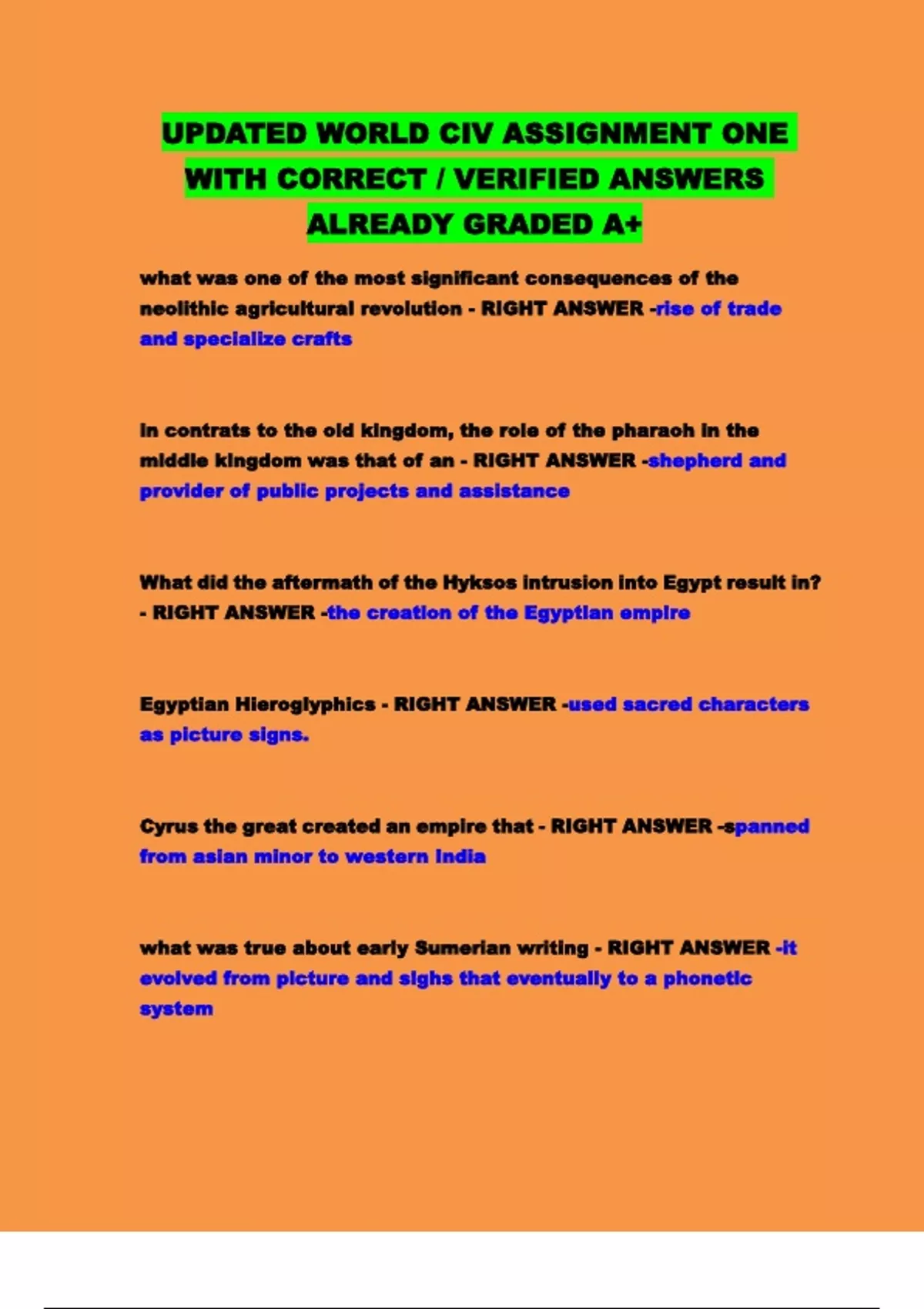 UPDATED WORLD CIV ASSIGNMENT ONE WITH CORRECT / VERIFIED ANSWERS ALREADY GRADED A+