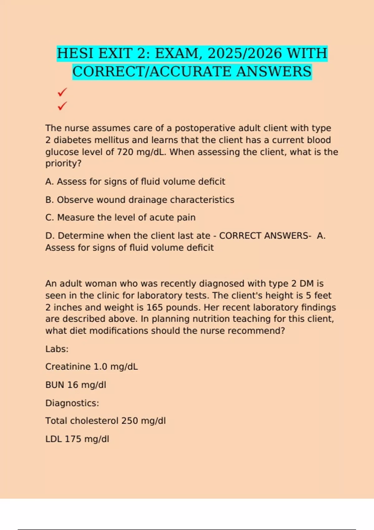 HESI EXIT 2: EXAM, 2025/2026 WITH CORRECT/ACCURATE ANSWERS