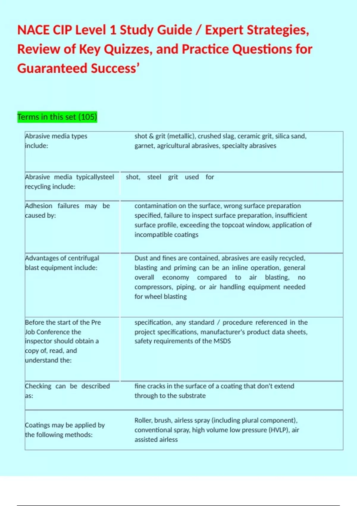 Terms in this set (105) Abrasive media types include: shot & grit (metallic), crushed slag, ceramic grit, silica sand, garnet, agricultural abrasives, specialty abrasives Abrasive media typicallysteel shot, steel grit used for recycling include: Adhesion failures may be caused by: contamination on the surface, wrong surface preparation specified, failure to inspect surface preparation, insufficient surface profile, exceeding the topcoat window, application of incompatible coatings Advantages of centrifugal blast equipment include: Dust and fines are contained, abrasives are easily recycled, blasting and priming can be an inline operation, general overall economy compared to air blasting, no compressors, piping, or air handling equipment needed for wheel blasting Before the start of the Pre Job Conference the inspector should obtain a copy of, read, and understand the: specification, any standard / procedure referenced in the project specifications, manufacturer's product data sheets, safety requirements of the MSDS Checking can be described as: fine cracks in the surface of a coating that don't extend through to the substrate