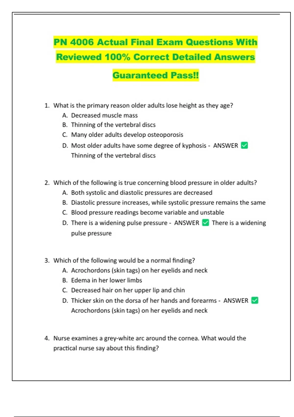 PN 4006 Actual Final Exam Questions With Reviewed 100% Correct Detailed Answers Guaranteed Pass!! 1. What is the primary reason older adults lose height as they age? A. Decreased muscle mass B. Thinning of the vertebral discs C. Many older adults develop osteoporosis D. Most older adults have some degree of kyphosis - ANSWER Thinning of the vertebral discs 2. Which of the following is true concerning blood pressure in older adults? A. Both systolic and diastolic pressures are decreased B. Diastolic pressure increases, while systolic pressure remains the same C. Blood pressure readings become variable and unstable D. There is a widening pulse pressure - ANSWER There is a widening pulse pressure 3. Which of the following would be a normal finding? A. Acrochordons (skin tags) on her eyelids and neck B. Edema in her lower limbs C. Decreased hair on her upper lip and chin D. Thicker skin on the dorsa of her hands and forearms - ANSWER Acrochordons (skin tags) on her eyelids and neck 4. Nurse examines a grey-white arc around the cornea. What would the practical nurse say about this finding? A. "You have the beginnings of cataracts and should an eye surgeon." B. "Theses are a normal finding in your age group and will not affect vision" C. "This is caused by thickening of your cornea and is probably causing some blurring of your vision" D. "This discolouration in your eyes is called xanthelasma and is caused by high levels of cholesterol" - ANSWER "Theses are a normal finding in your age group and will not affect vision" 5. Mrs. Sloane is to receive olive oil in both ears at night for cerumen impaction. What intervention should the practical nurse perform? A. Application of a small cotton ball at the meatus after instillation of the ear drops B. Removal of coarse ear hairs C. Referral to an ENT physician D. Evacuation of the cerumen using a cotton-tipped swab - ANSWER Application of a small cotton ball at the meatus after instillation of the ear drops